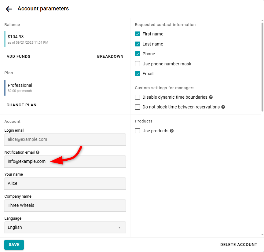 En la configuración de tu cuenta, ingresa tu Correo de notificación. Usaremos este correo electrónico para enviarte notificaciones del servicio.