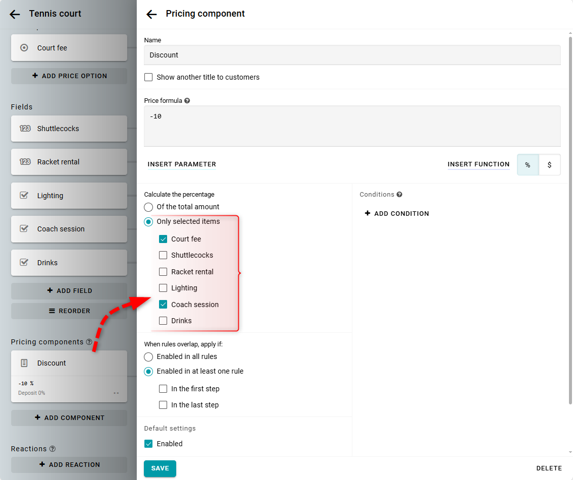 Sí, puedes calcular el descuento según tarifas y campos específicos. Para esto, abre el ajuste de precio de tu descuento. En la sección Calcular descuento, selecciona la opción llamada Solo de los seleccionados. Luego puedes indicar qué tarifas y campos se incluirán en el cálculo del descuento.