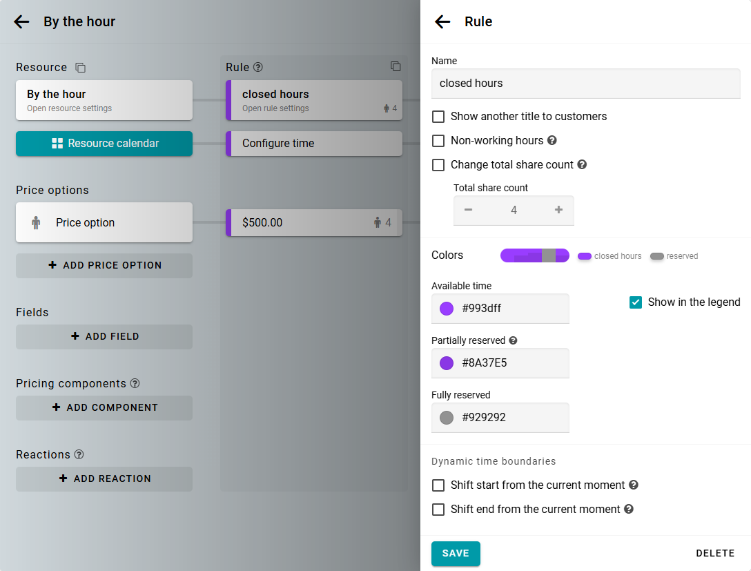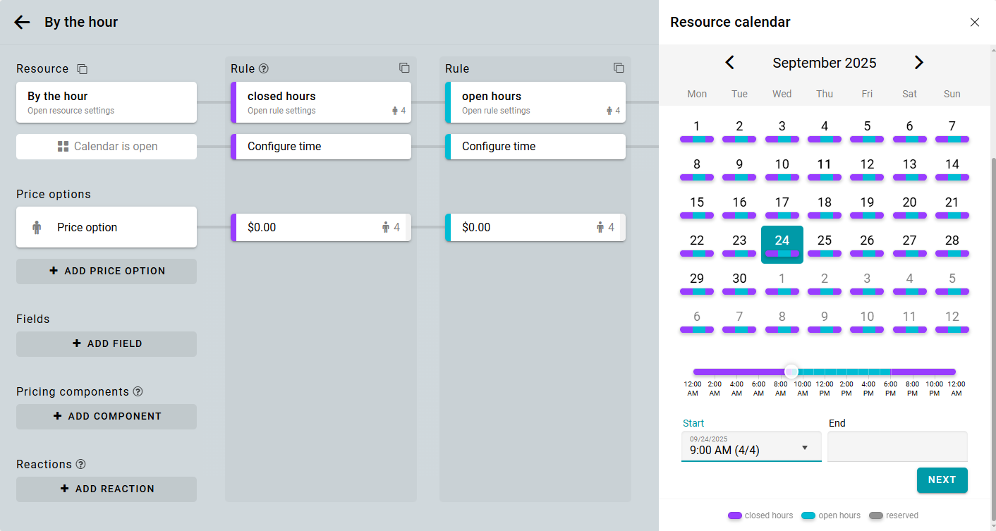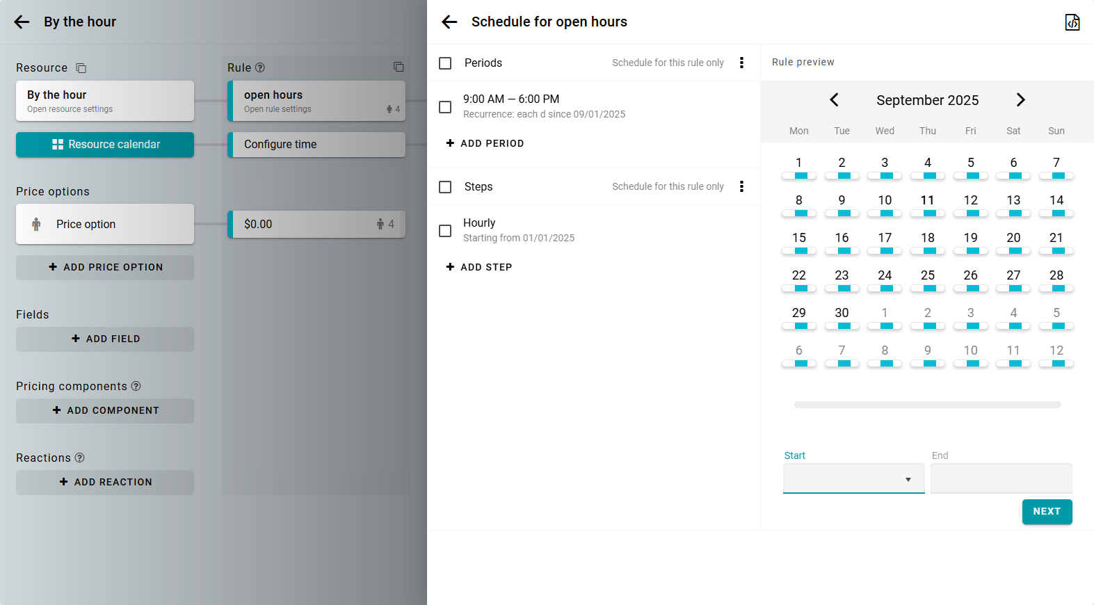 Crea una regla para alquileres por hora. Por ejemplo, tu horario laboral es de 9:00 a 18:00 cada día.