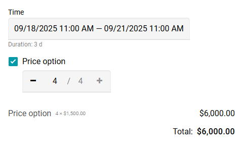 Vamos a comprobar la configuración. Reserva 4 unidades por 3 días. El cálculo será: 500 * 3 * 4 = $6,000.