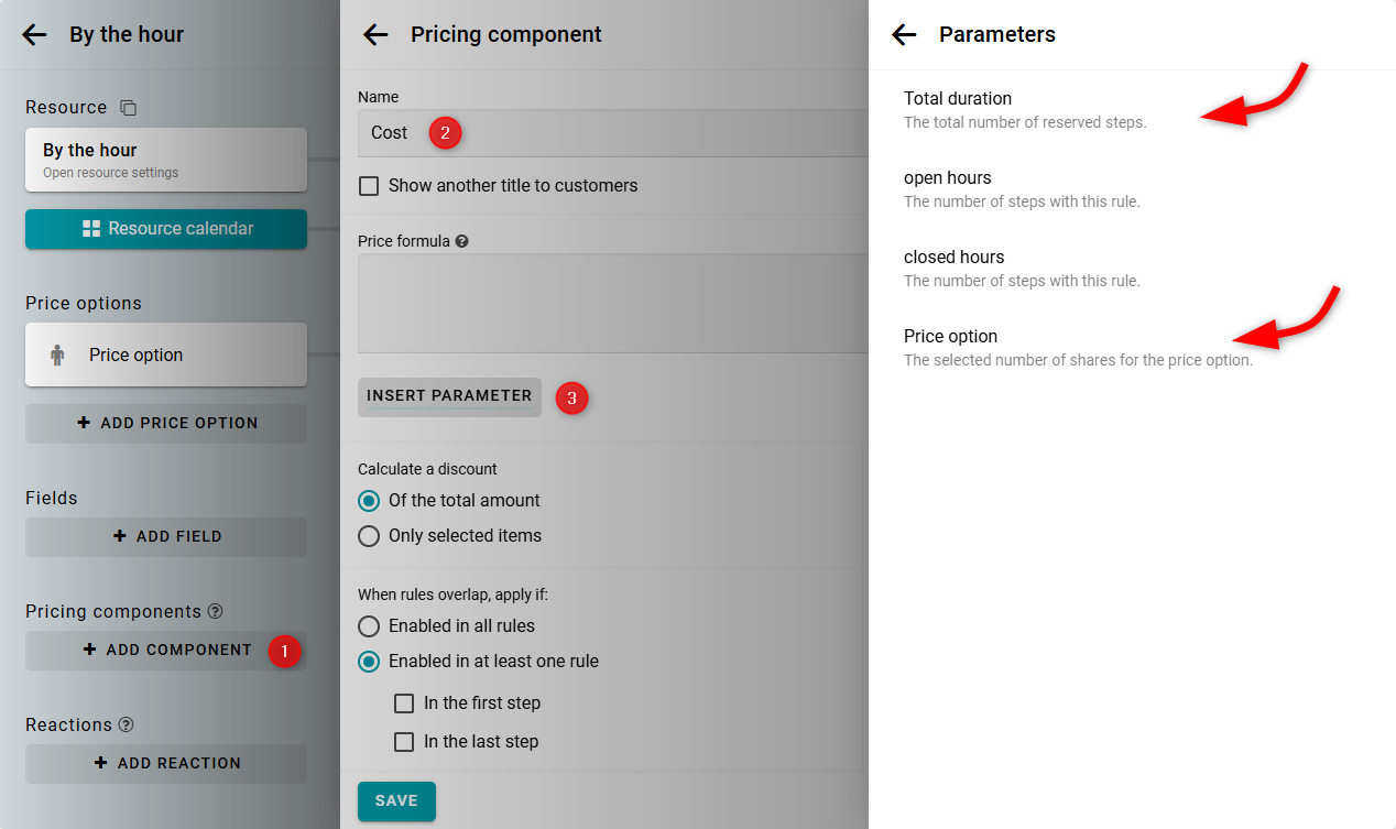 Ingresa el nombre del componente. Haz clic en el botón Insertar parámetro. Inserta los parámetros para la duración total en horas [STEPS] y para las unidades de la tarifa [P1].