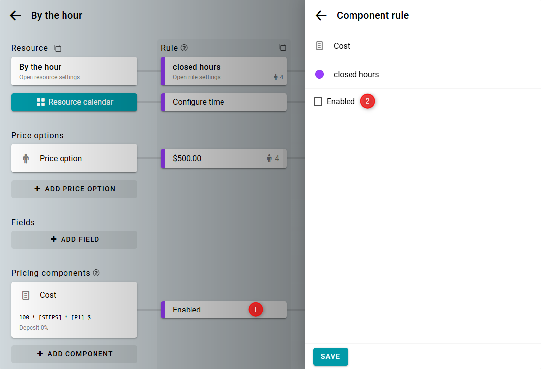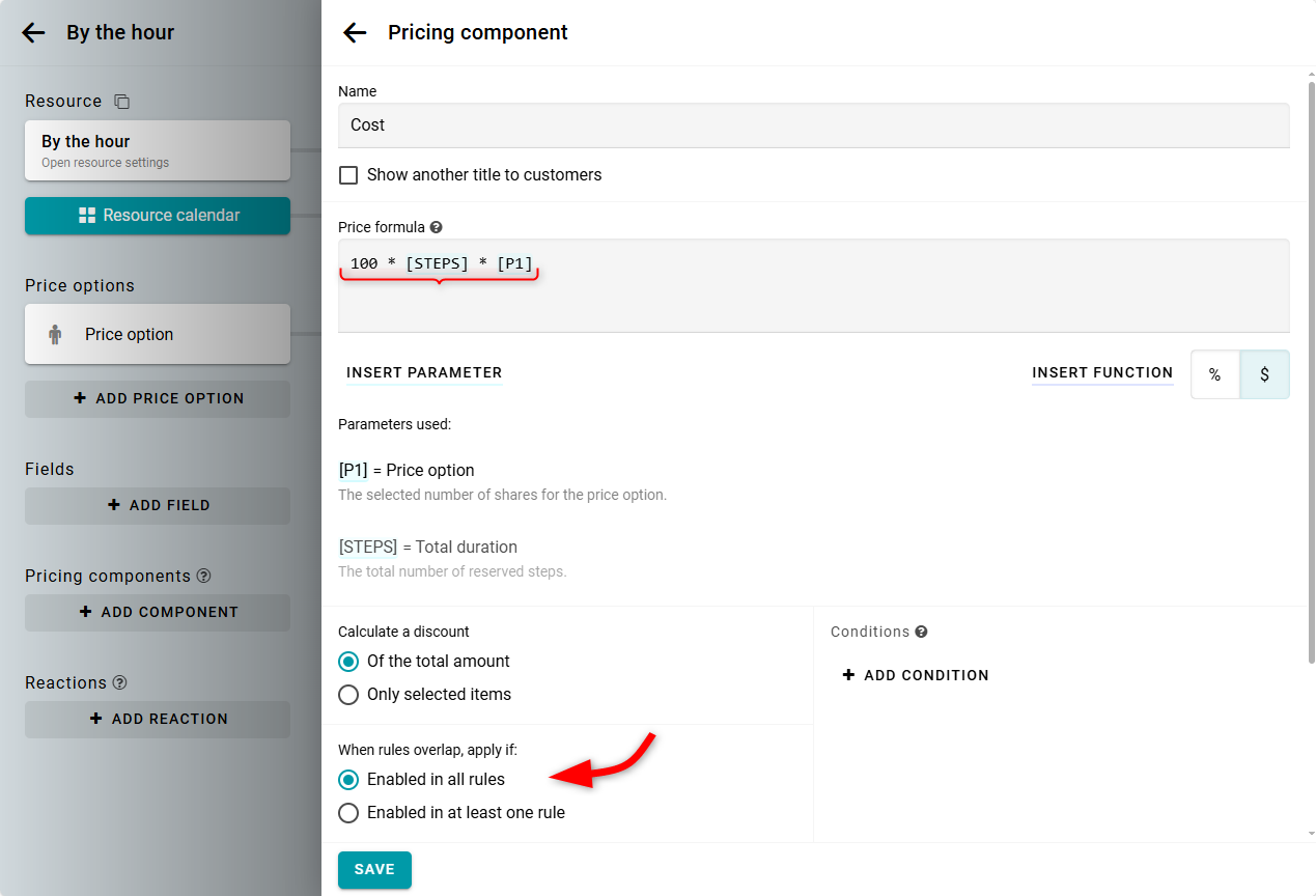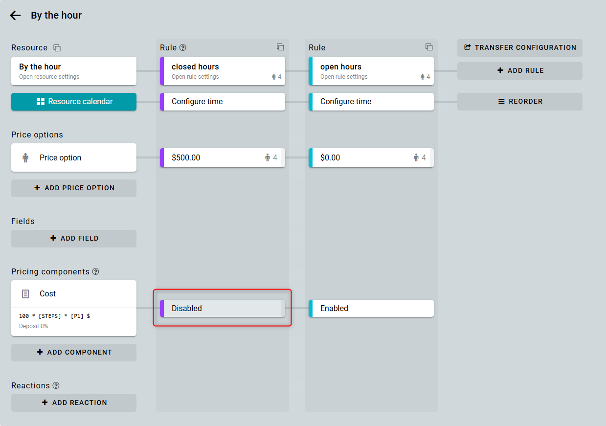 Ahora, pon el componente como Activo en todas las reglas. Así, el componente se aplicará solo si está activo durante todo el período reservado.