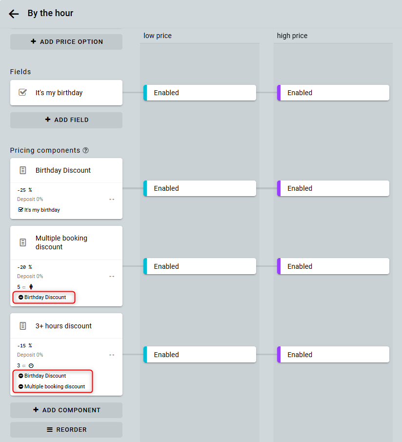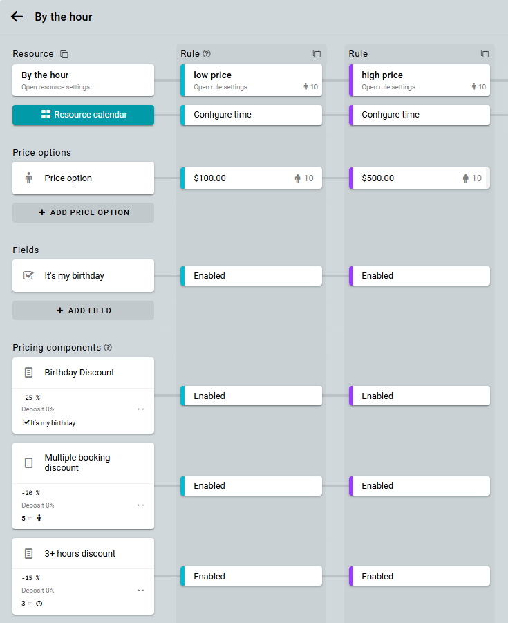 Supón que ya tienes un recurso con varios ajustes de precio. Por ejemplo, un alquiler por hora con los siguientes descuentos:
