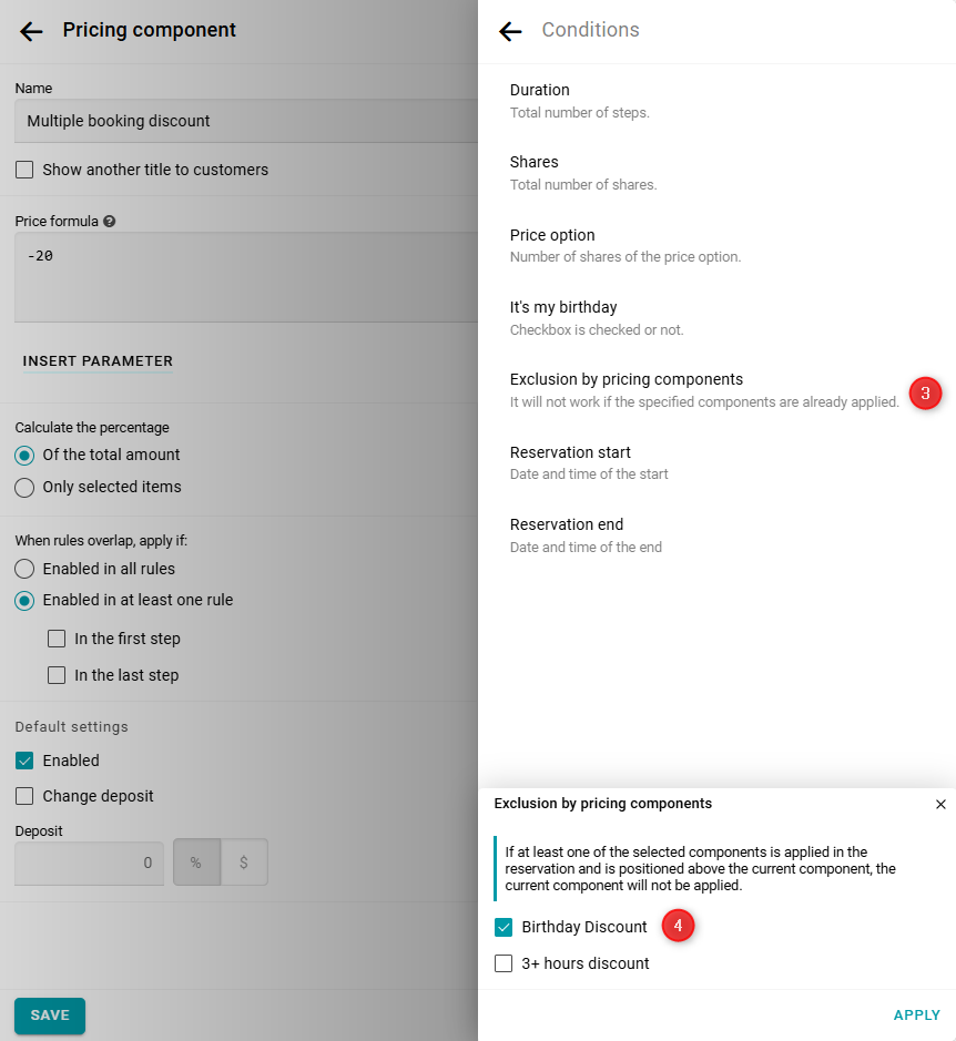 Exclusión por ajustes de precio, y elige los componentes que deben desactivar este descuento. En este caso, selecciona ambos descuentos anteriores.