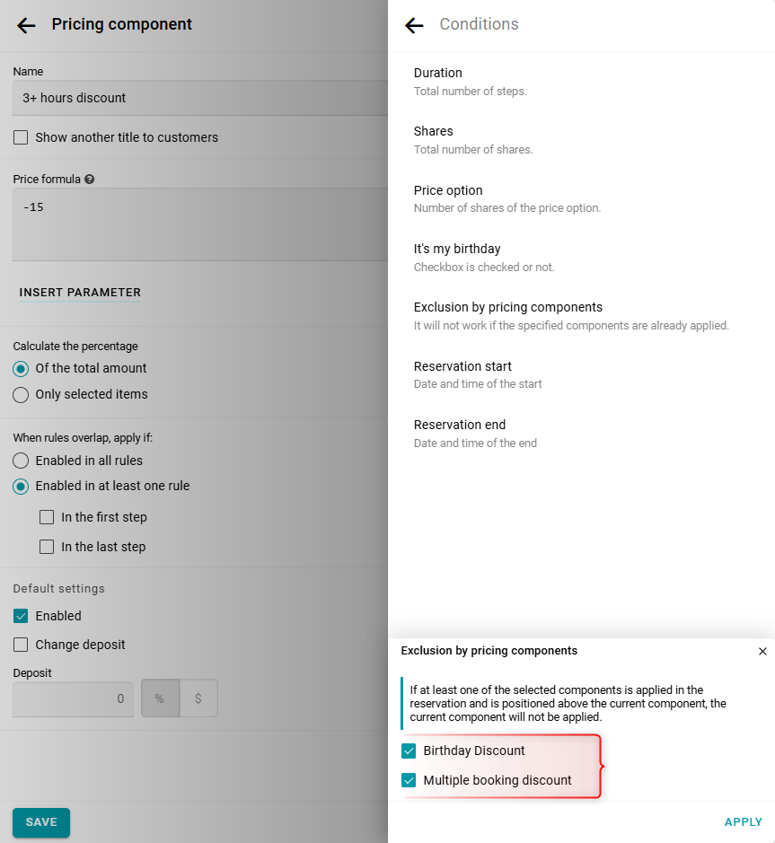 Luego, selecciona Exclusión por ajustes de precio de la lista de condiciones. Elige el componente que debe desactivar este descuento cuando se aplique. En este caso, selecciona el descuento por cumpleaños.