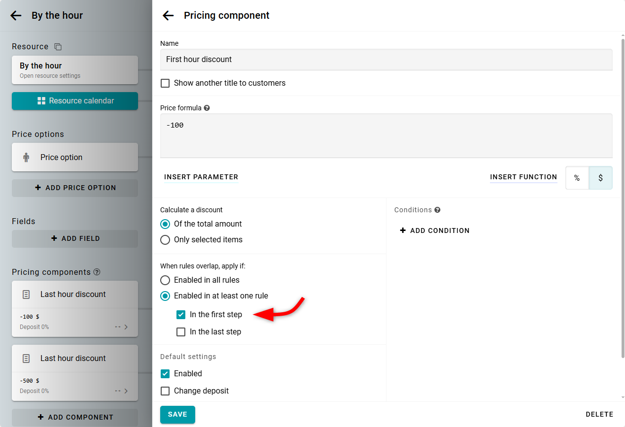 Para aplicar un descuento en la primera hora, marca la casilla En el primer paso.
