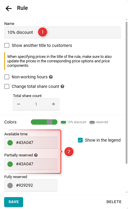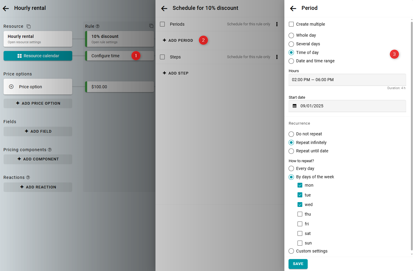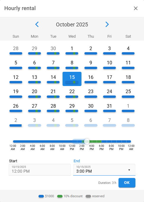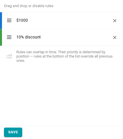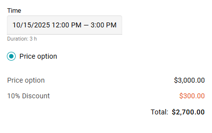El descuento sobre el monto total es válido incluso si la reserva abarca varias reglas. Por ejemplo, de 12:00 a 15:00.