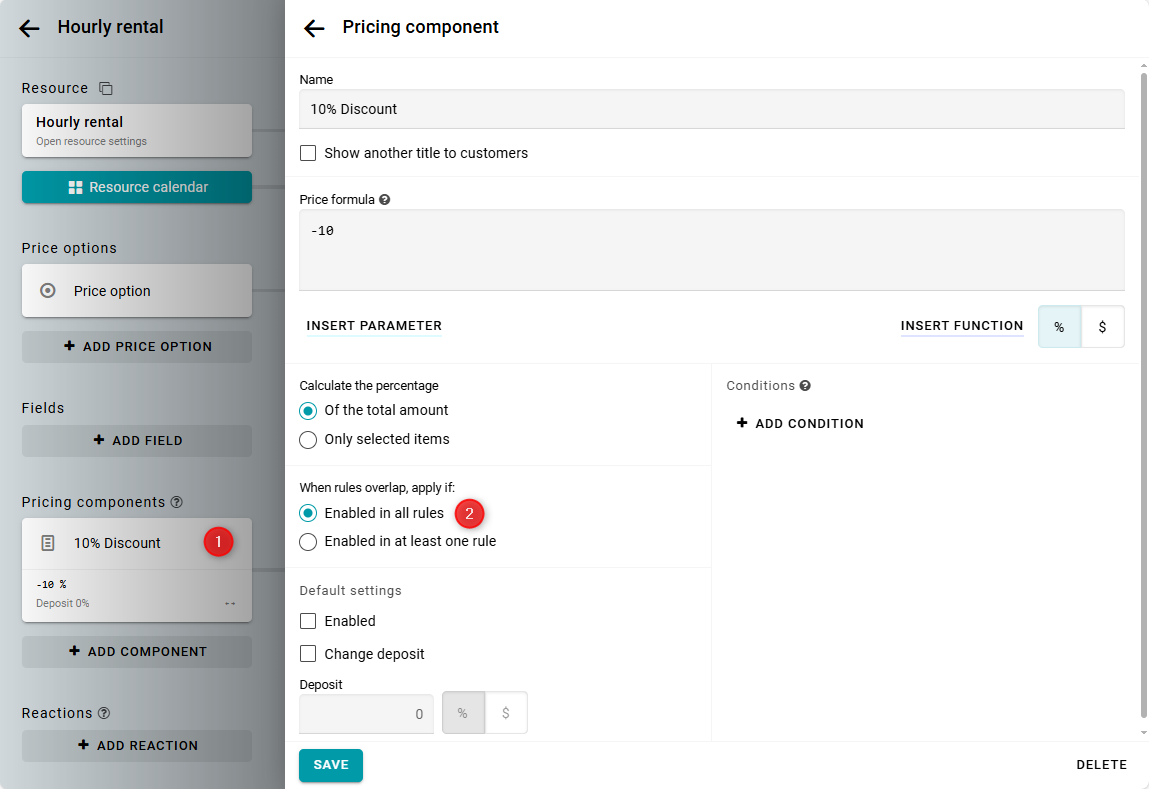 Puedes configurar el descuento para que solo se aplique dentro de la regla, así no se aplicará cuando las reservas abarquen varias reglas. Para esto, abre la configuración del componente. En la sección Cuando las reglas se superponen, aplicar si, selecciona Activo en todas las reglas y guarda.