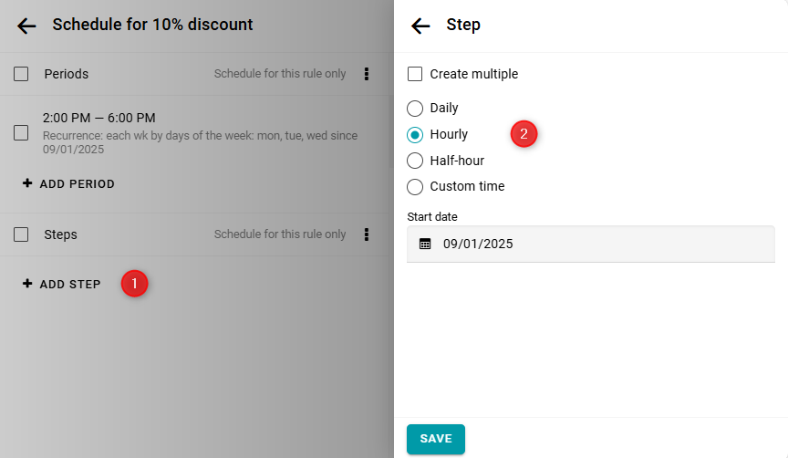 En el formulario de configuración de tiempo, haz clic en el botón Agregar período. Ingresa la hora de inicio y fin para el período en el que se debe aplicar el descuento. Si el descuento es recurrente, especifica cómo debe repetirse este período en el tiempo.