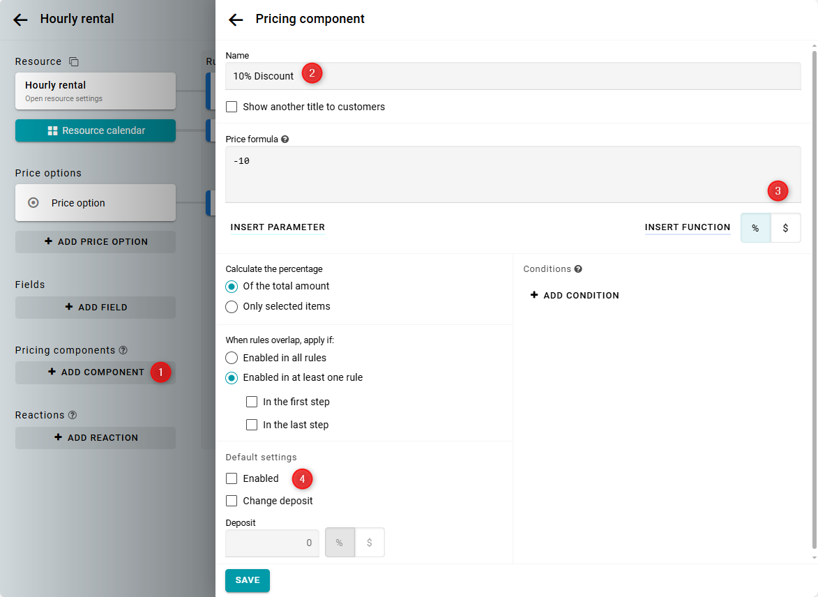 Ingresa el nombre, pon la fórmula en "-10" y selecciona "%". Desactiva el componente para que no se aplique a todas las reglas por defecto.