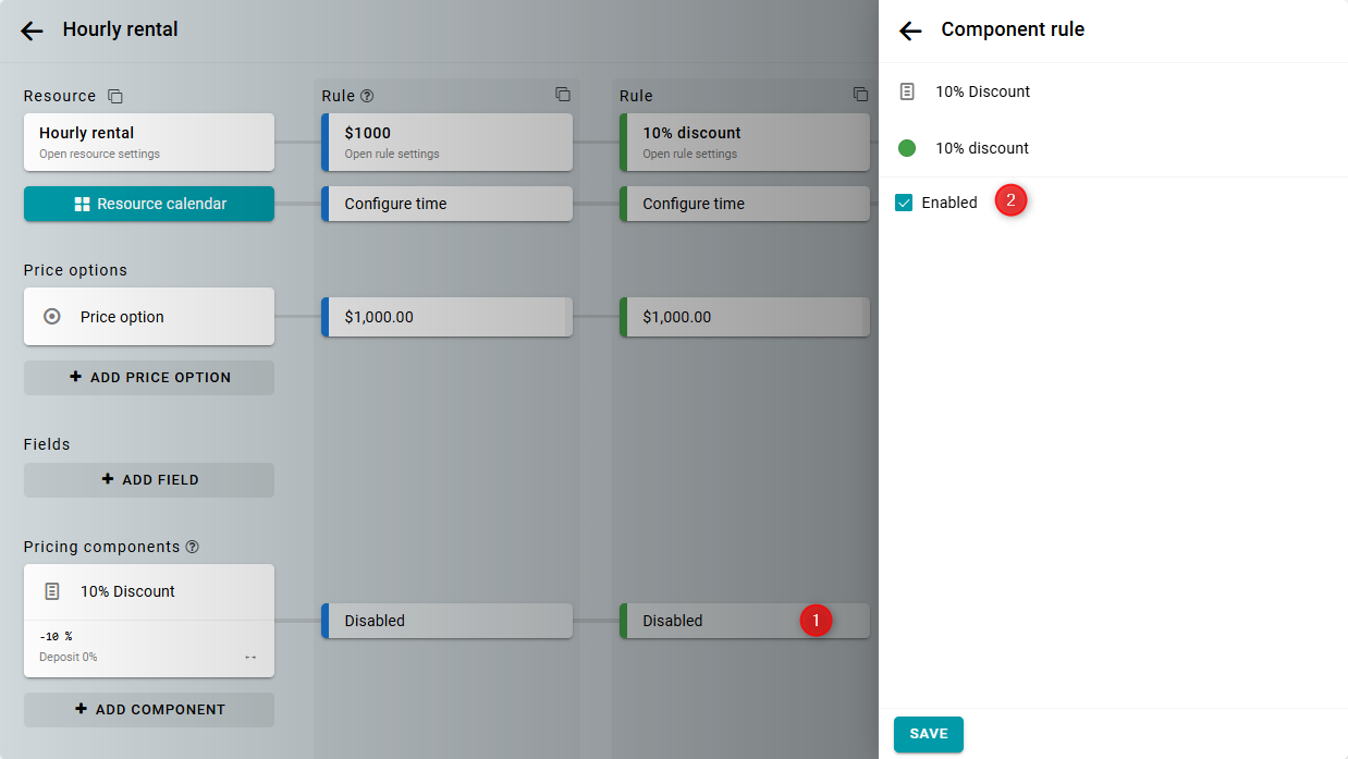 Luego, haz clic en la intersección de la nueva regla y el componente. Activa el ajuste de precio para esta regla y guarda.