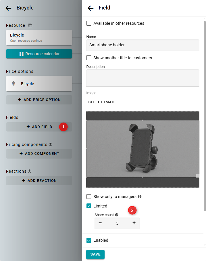 En el formulario de configuración del campo, ingresa un nombre. Si lo necesitas, también puedes subir una imagen. Marca la casilla Limitado y especifica la Cantidad de unidades. Esto representa el número total de unidades de equipo disponibles. Guarda los cambios.