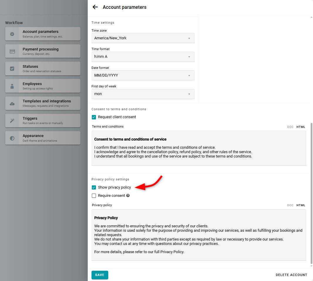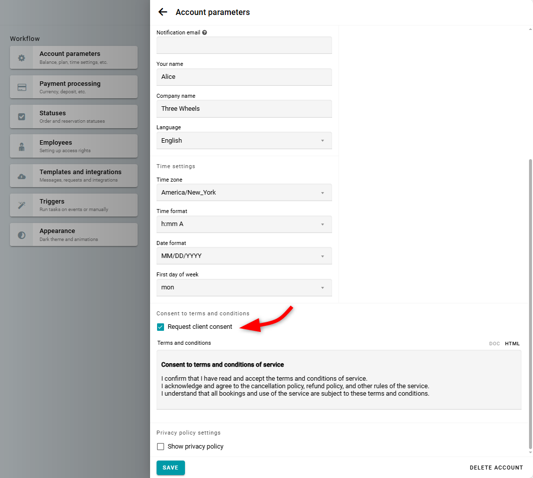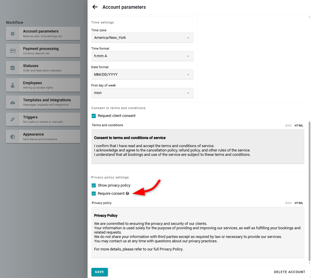 Para recopilar correctamente el consentimiento del cliente de acuerdo con los requisitos del RGPD, sigue estos pasos en Parámetros de la cuenta.
