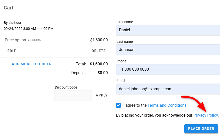 Tu política de privacidad se mostrará como un enlace en el widget, permitiendo que los clientes la revisen antes de completar su pedido. Debajo se muestra un ejemplo de cómo se ve esto en el widget.