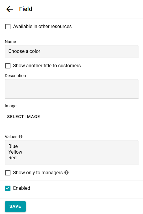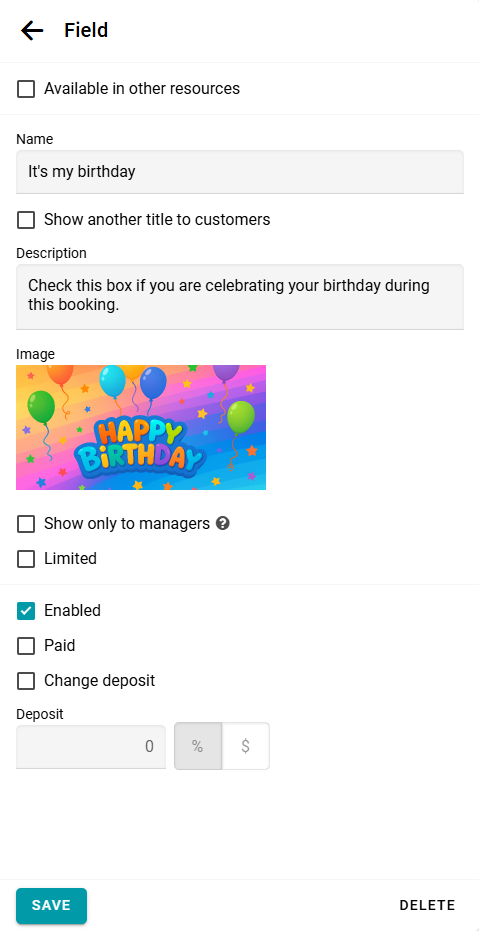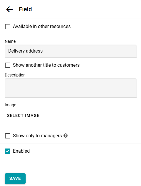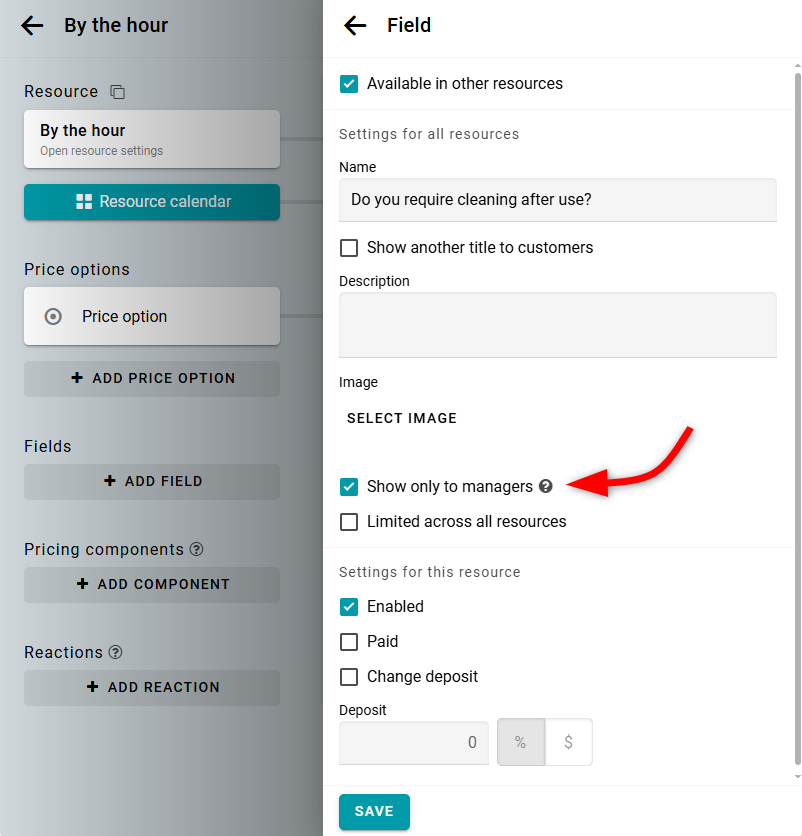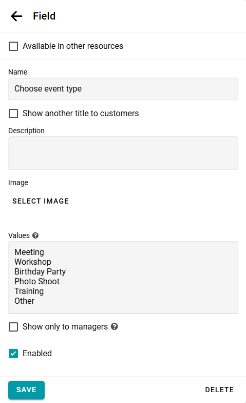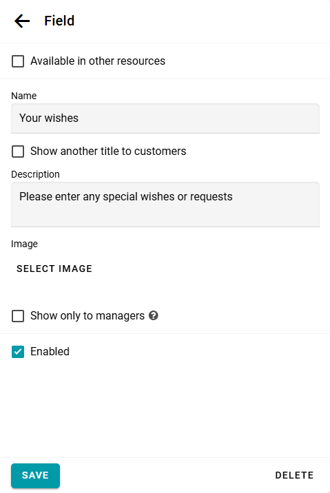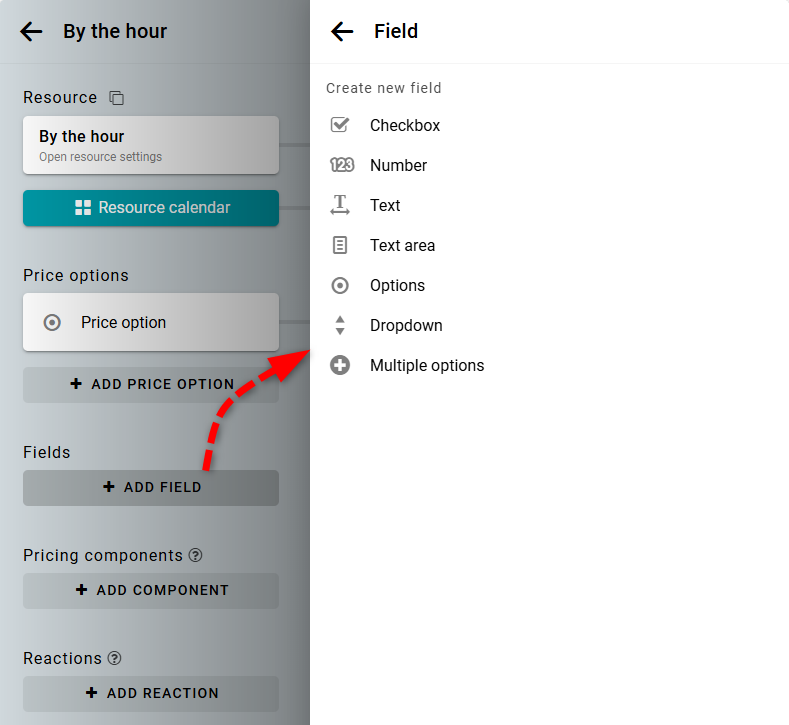 Puedes recopilar cualquier información que necesites de tus clientes durante el proceso de reserva. Para esto, abre el panel de configuración del recurso y agrega el campo necesario.