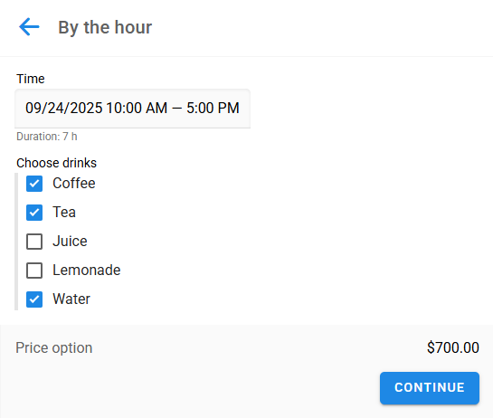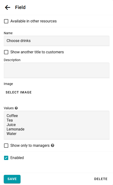 Si el cliente puede seleccionar varias opciones a la vez, usa un campo de Opciones múltiples. Por ejemplo, para bebidas: