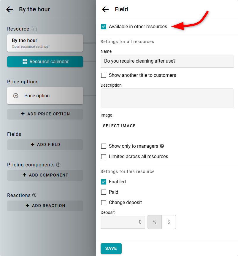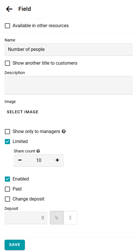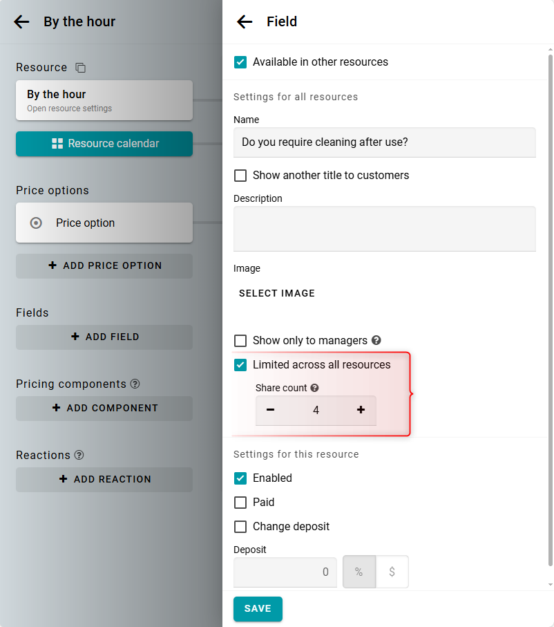 Nota: Si un campo se usa en varios recursos y tiene un límite de cantidad, este límite se compartirá entre todas las reservas en todos los recursos donde el campo esté activo.