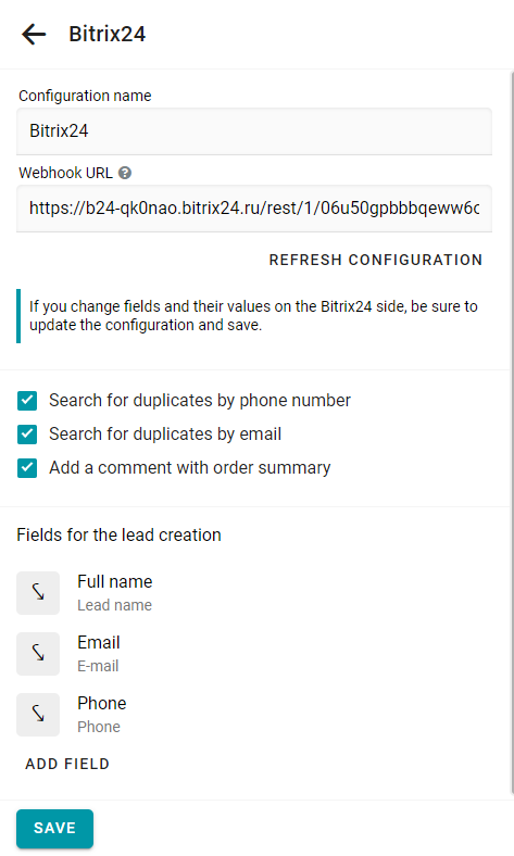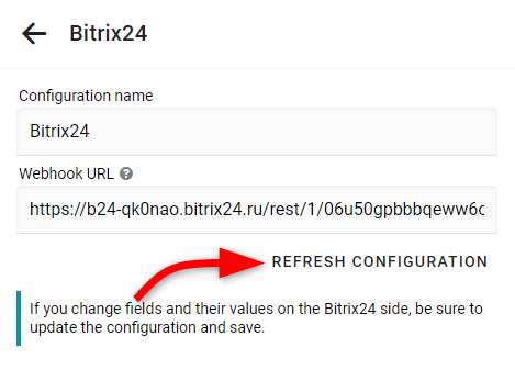 Si agregaste nuevos campos o actualizaste valores de campos existentes en Bitrix24, asegúrate de hacer clic en Actualizar configuración en Bukza y guardar los ajustes.
