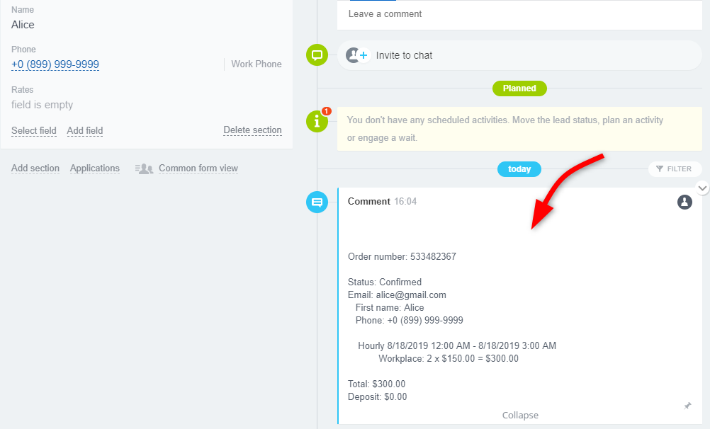 También puedes agregar un comentario con los datos del pedido al lead, trato y contacto. El comentario incluirá un resumen del pedido: