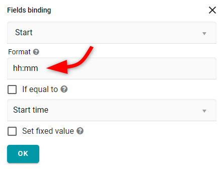 - Para fechas, puedes especificar tu propio formato, por ejemplo, 'dd.MM' para fecha corta o 'HH:mm' para hora. Si dejas el formato vacío, se usará el formato de fecha predeterminado de Bitrix24: