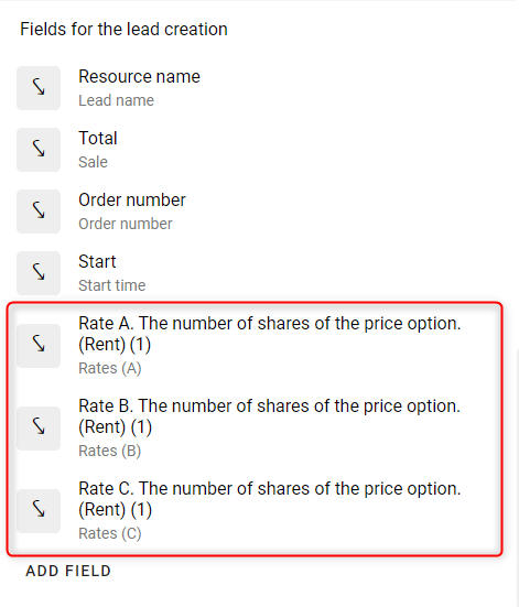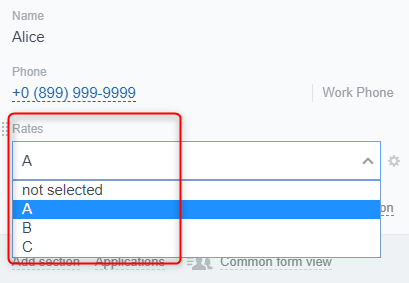 Supón que tienes tarifas para el recurso completo: Tarifa A, Tarifa B, Tarifa C. Pero en Bitrix24, estas se representan como una lista de valores: A, B, C.