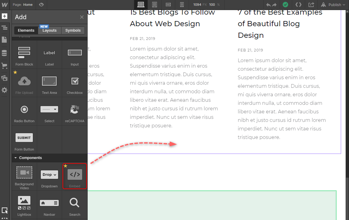 3. Selecciona el widget Insertar y arrástralo a la ubicación deseada en la página.
