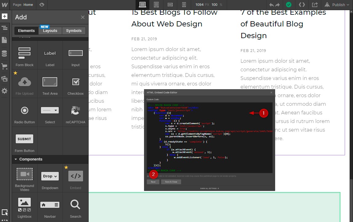 4. Pega el código del widget que copiaste antes en el área de inserción.