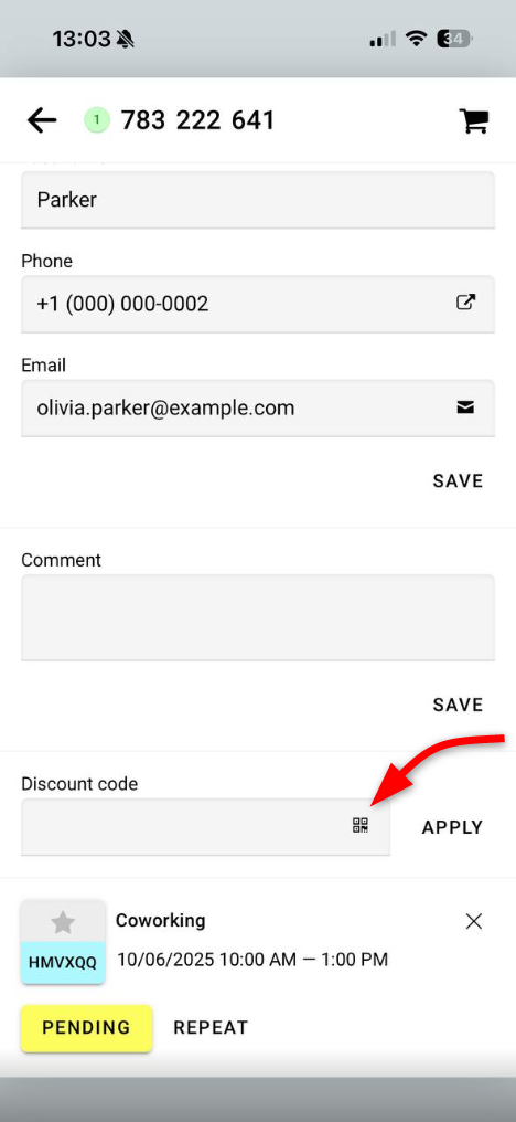 Solo toca el botón de escanear junto al campo de código, y el código se agregará al pedido.