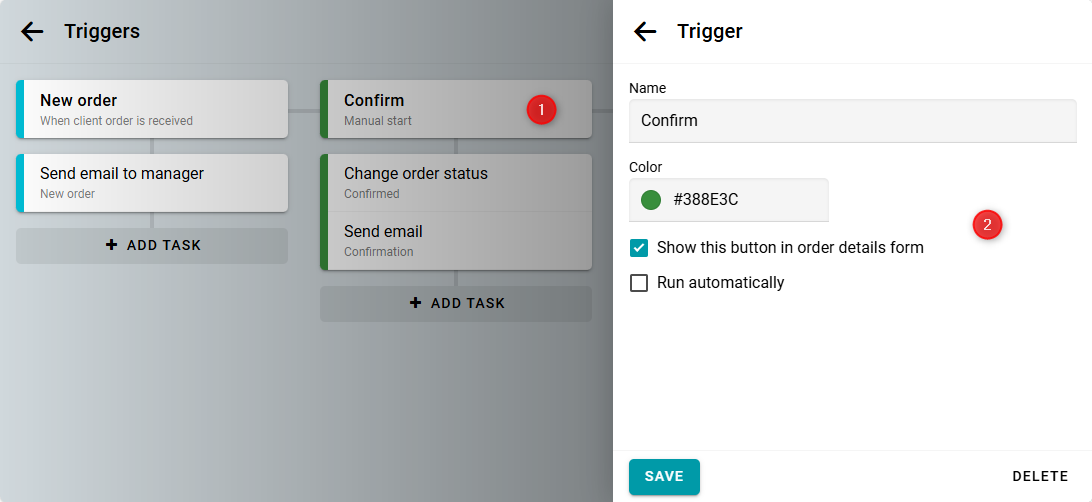 Puedes mostrar este botón en el formulario de pedido del administrador. Para esto, activa la casilla correspondiente en la configuración de la automatización. El botón aparecerá en la pestaña Automatizaciones.