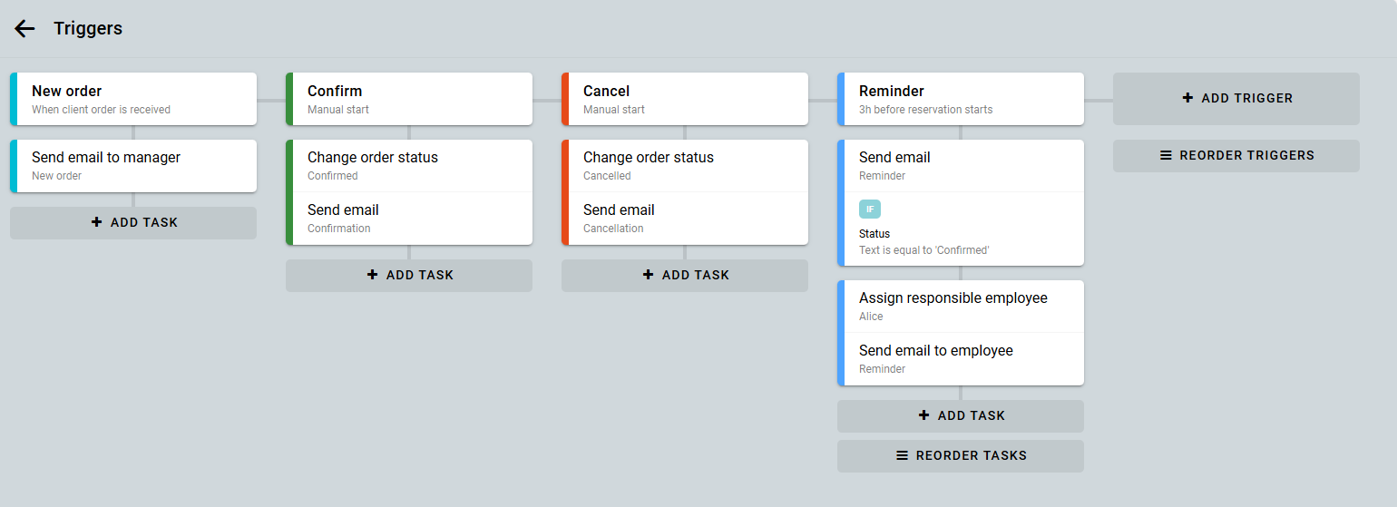 Cada tarea puede incluir una o más acciones, como cambiar el estado, enviar un correo electrónico y más.