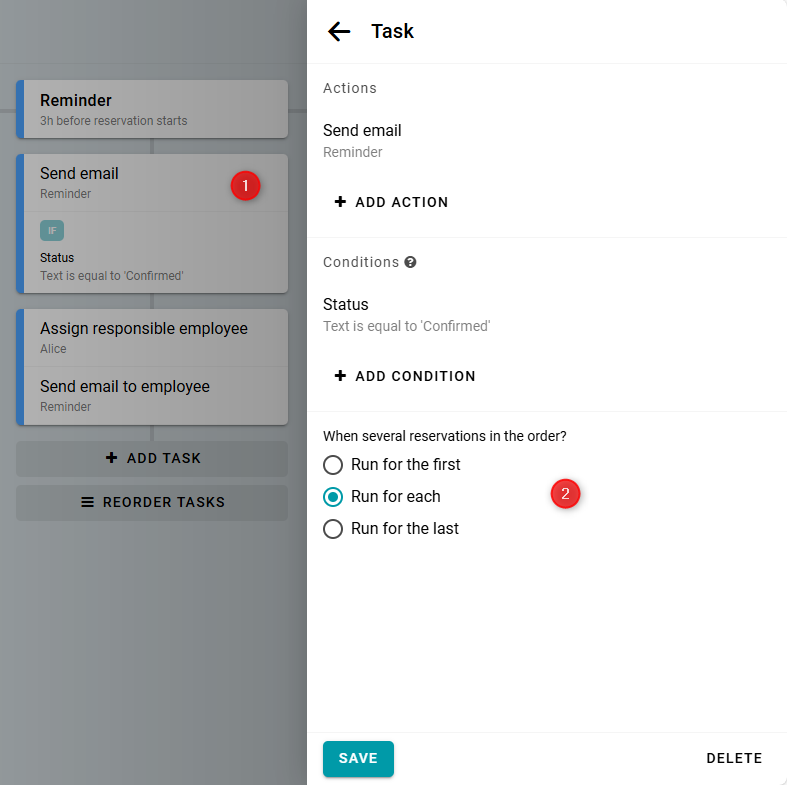 Puedes especificar cómo debe ejecutarse una tarea si hay varias reservas en un pedido.