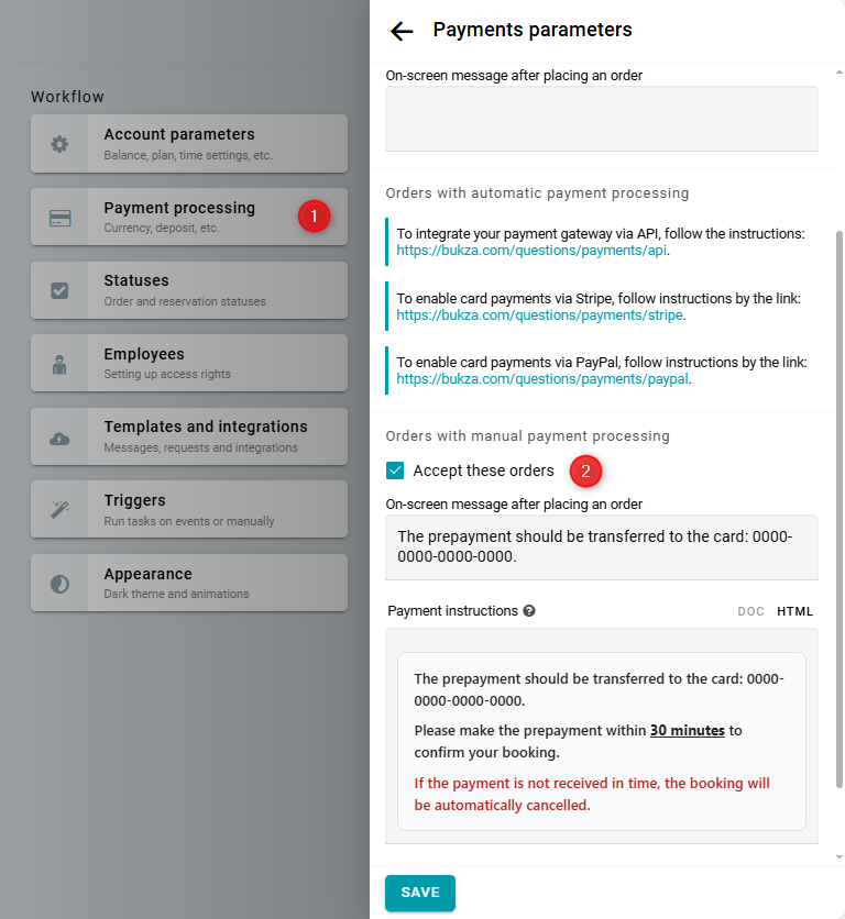 Marca la casilla Aceptar estos pedidos en la sección Pedidos con procesamiento manual de pagos.
