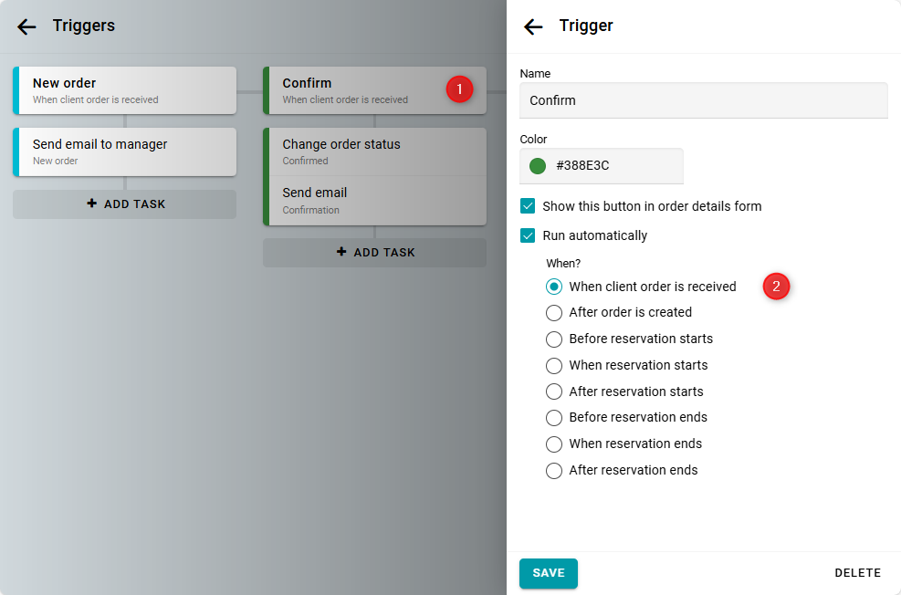 También puedes activar la confirmación automática de pedidos. En este caso, los pedidos recibirán inmediatamente el estado "Confirmado". Sin embargo, igual tendrás que cancelar los pedidos que no se paguen a tiempo. Para configurar este comportamiento, crea una automatización que se ejecute Cuando se recibe el pedido del cliente. Agrega una tarea a la automatización — Cambiar el estado a "Confirmado". También puedes agregar una acción para enviar un mensaje de confirmación.