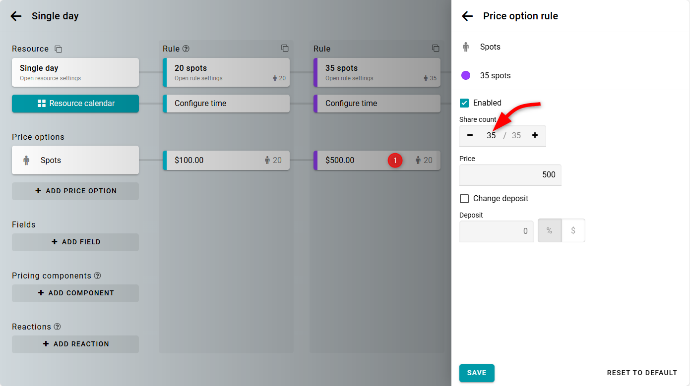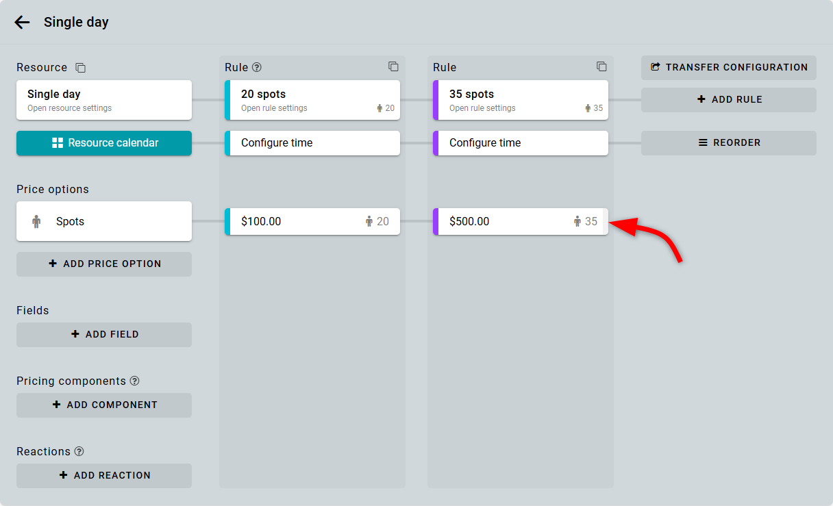 Luego, haz clic en la intersección de esa regla y la tarifa. En el formulario que se abre, indica la Cantidad de unidades deseada para la tarifa.