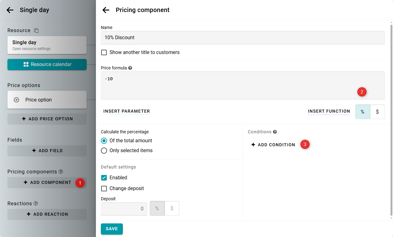 Ahora necesitas vincular esta tarjeta de descuento a un recurso. Para esto, ve a la configuración del recurso. Luego crea un Ajuste de precio.