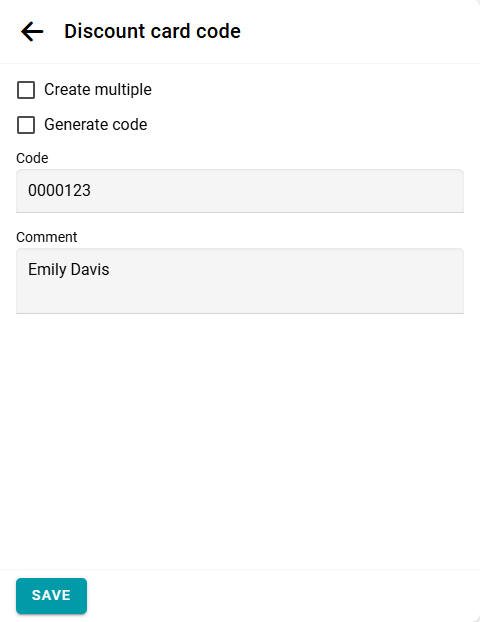 Ingresa el Código para la tarjeta de descuento. Si lo necesitas, agrega un comentario— por ejemplo, el nombre y apellido del cliente. Haz clic en Guardar.