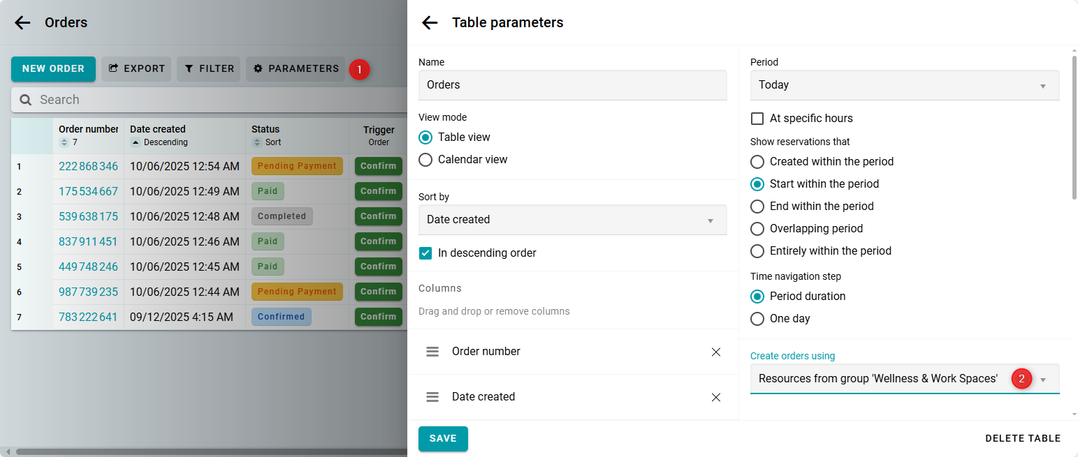 Luego, abre los Parámetros de la tabla y selecciona el widget o grupo de recursos que creaste para la gestión de pedidos.