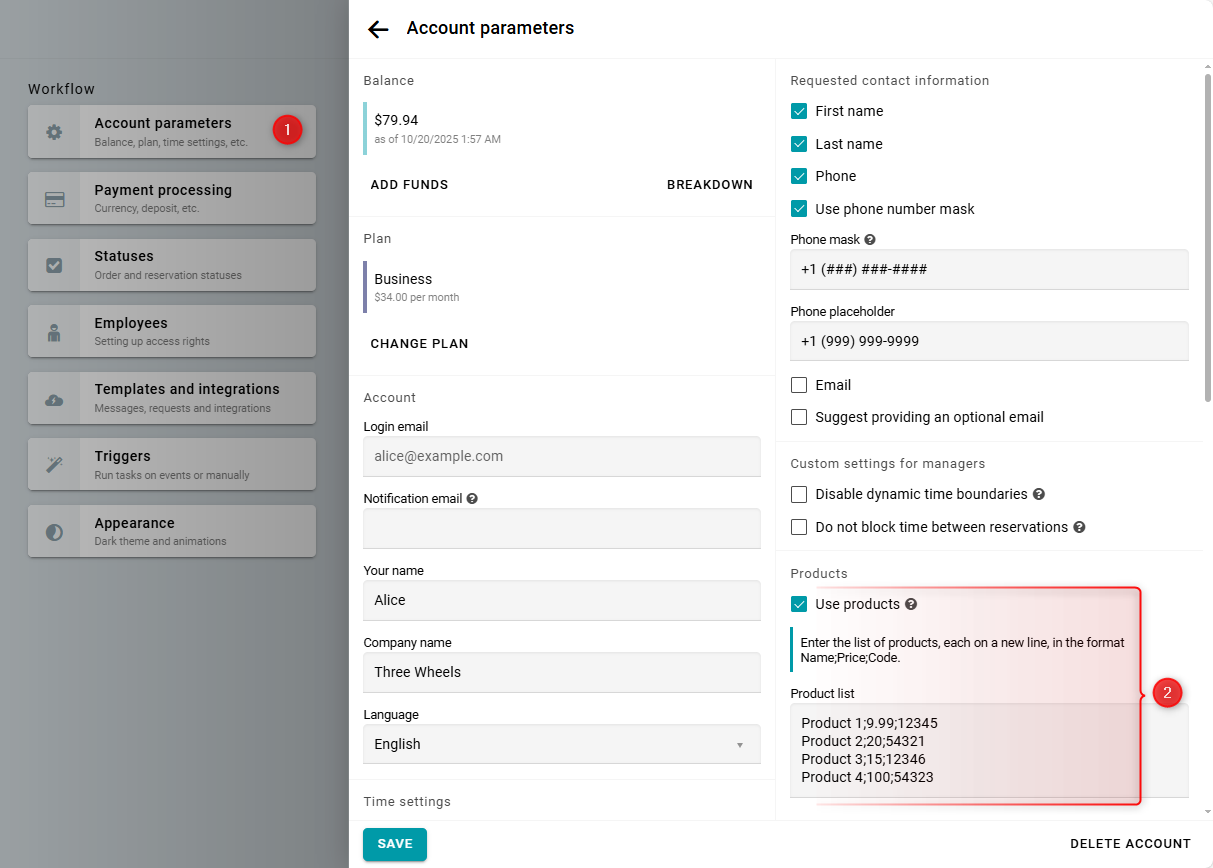 Abre el panel principal y haz clic en Parámetros de la cuenta. Activa la casilla Usar productos. Ingresa tu lista de productos en formato CSV: Nombre;Precio;Código.