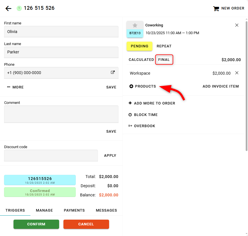 Luego, abre los detalles del pedido y selecciona Productos en la pestaña FINAL.