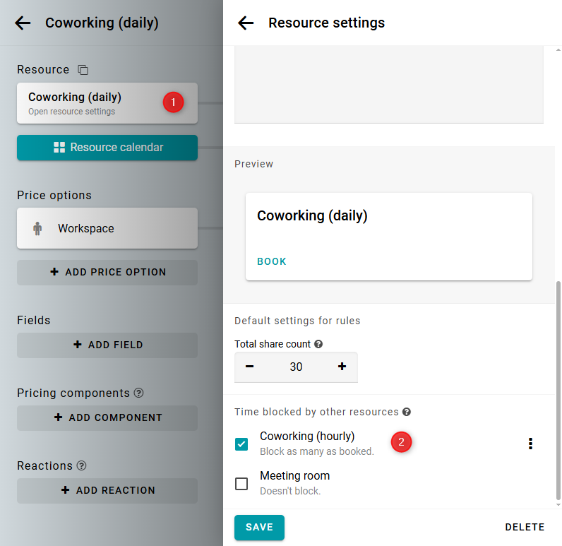 Puedes bloquear la disponibilidad de un recurso cuando otro recurso está reservado. Para esto, selecciona los recursos de bloqueo en la configuración del recurso objetivo.