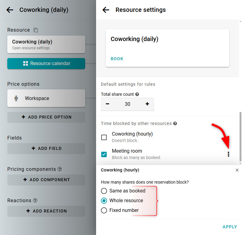 Por defecto, el recurso de bloqueo ocupará la misma cantidad de unidades en el recurso principal que las reservadas en el recurso de bloqueo. Por ejemplo, si se reservan 5 plazas en el recurso de bloqueo, entonces también se bloquearán 5 plazas en el recurso principal. Si usas la tarifa para el Recurso completo, la reserva ocupará todas las unidades del recurso principal.