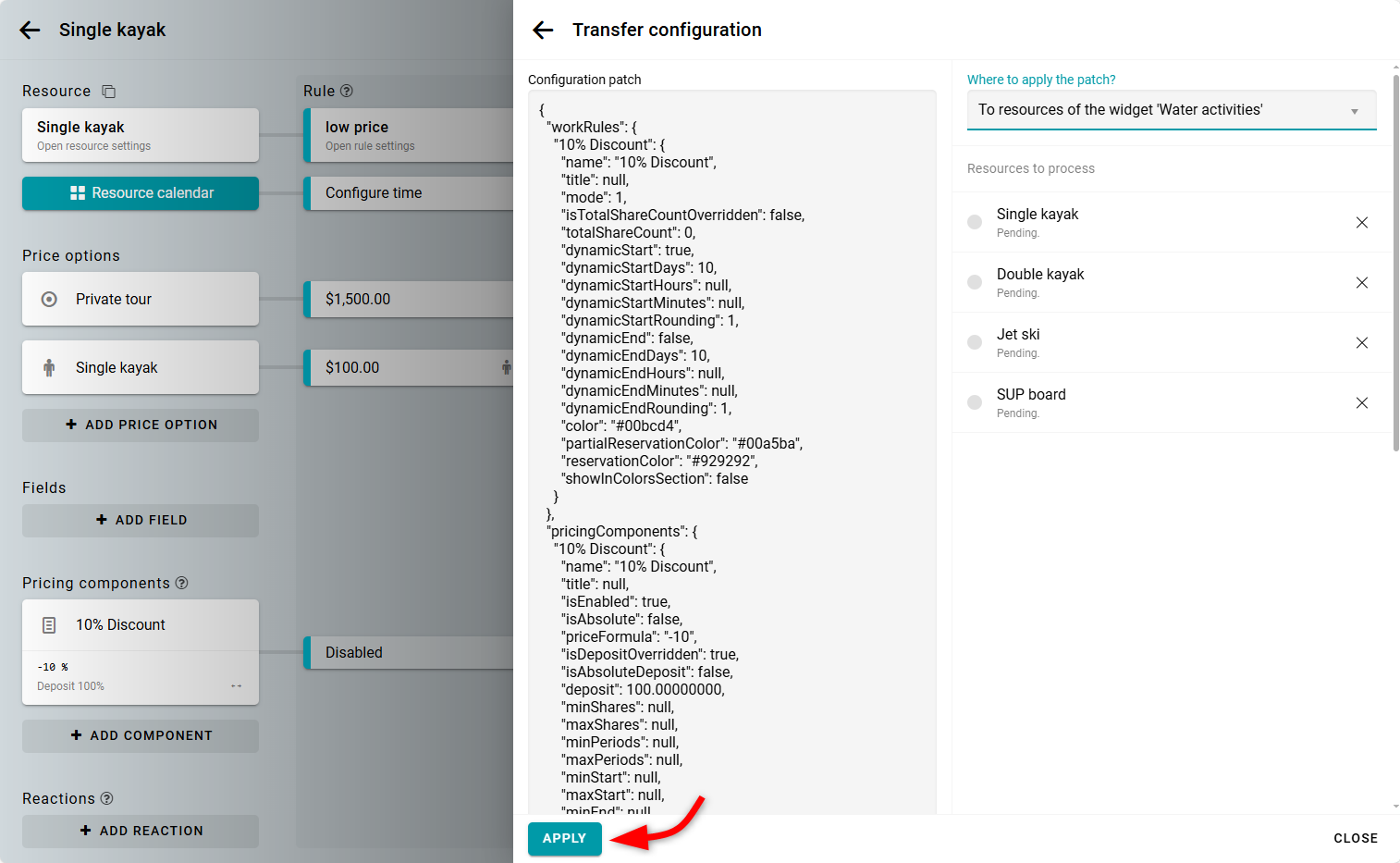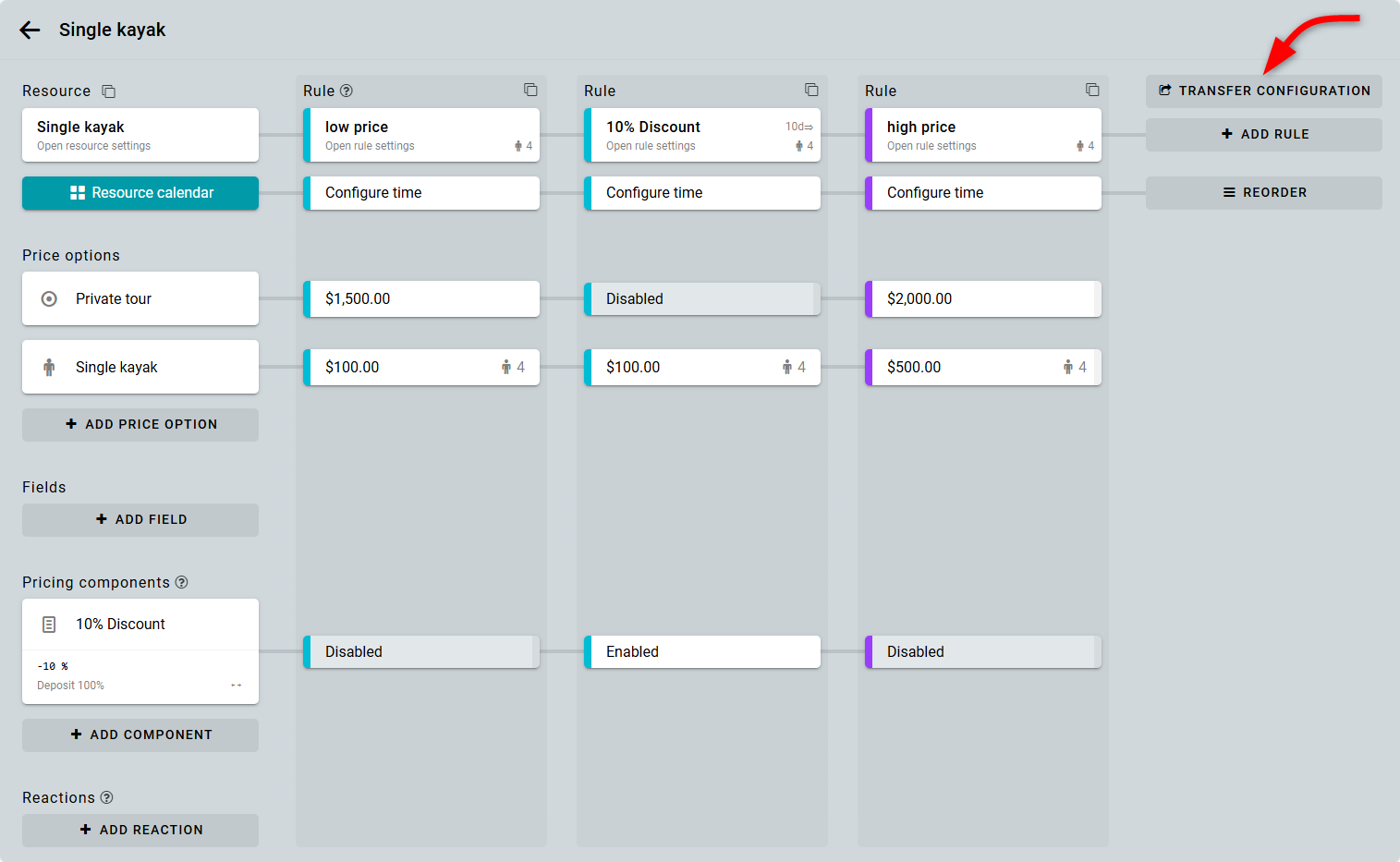 Para transferir la configuración, abre el recurso donde ya tienes configurada la configuración deseada. Haz clic en el botón Transferir configuración en la esquina superior derecha.