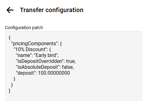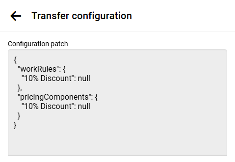 Si lo necesitas, puedes quitar ciertos ajustes del parche de configuración para dejarlos sin cambios en los recursos. Por ejemplo, puedes actualizar en lote los ajustes de anticipo de un ajuste de precio sin cambiar su fórmula u otros ajustes: