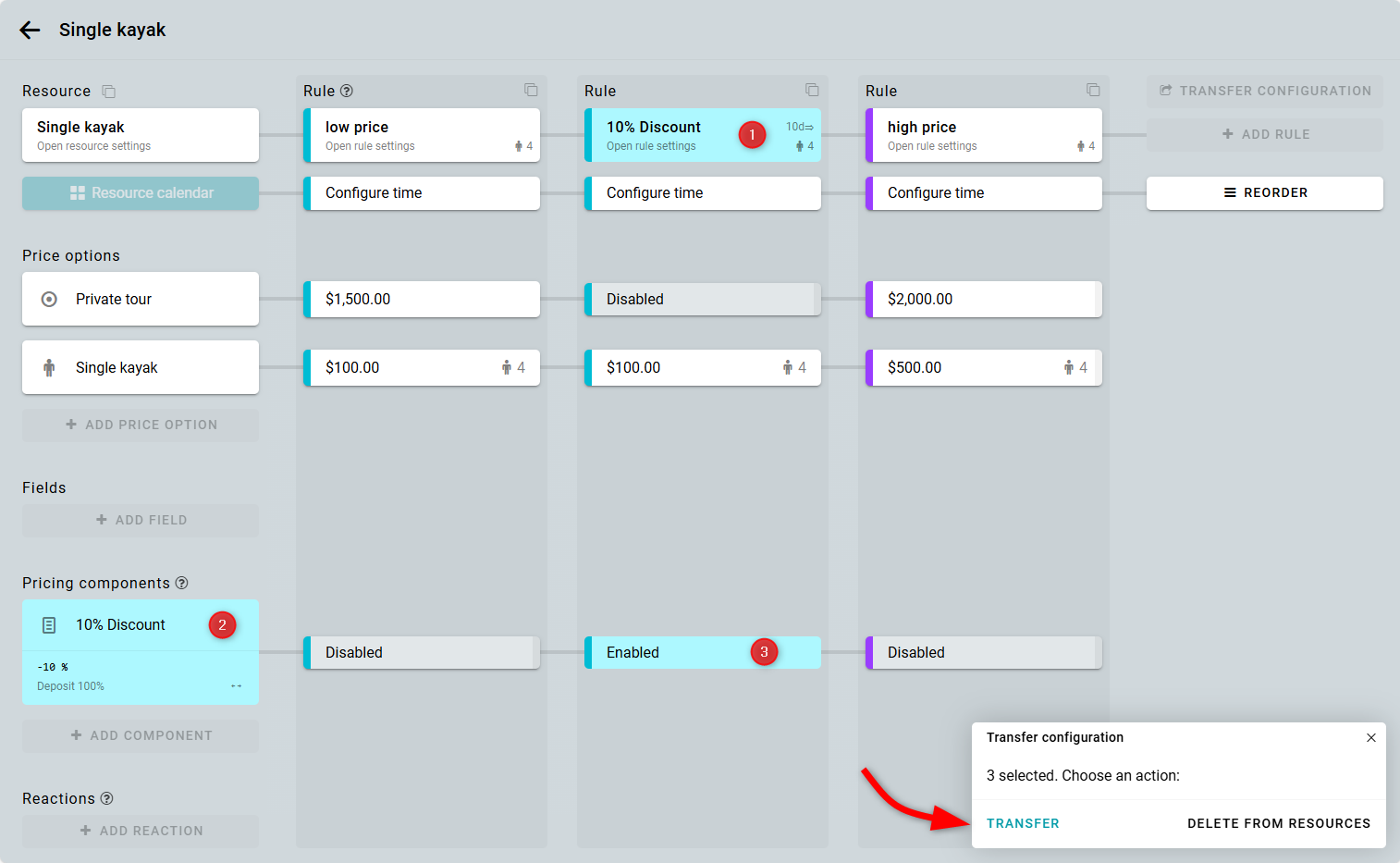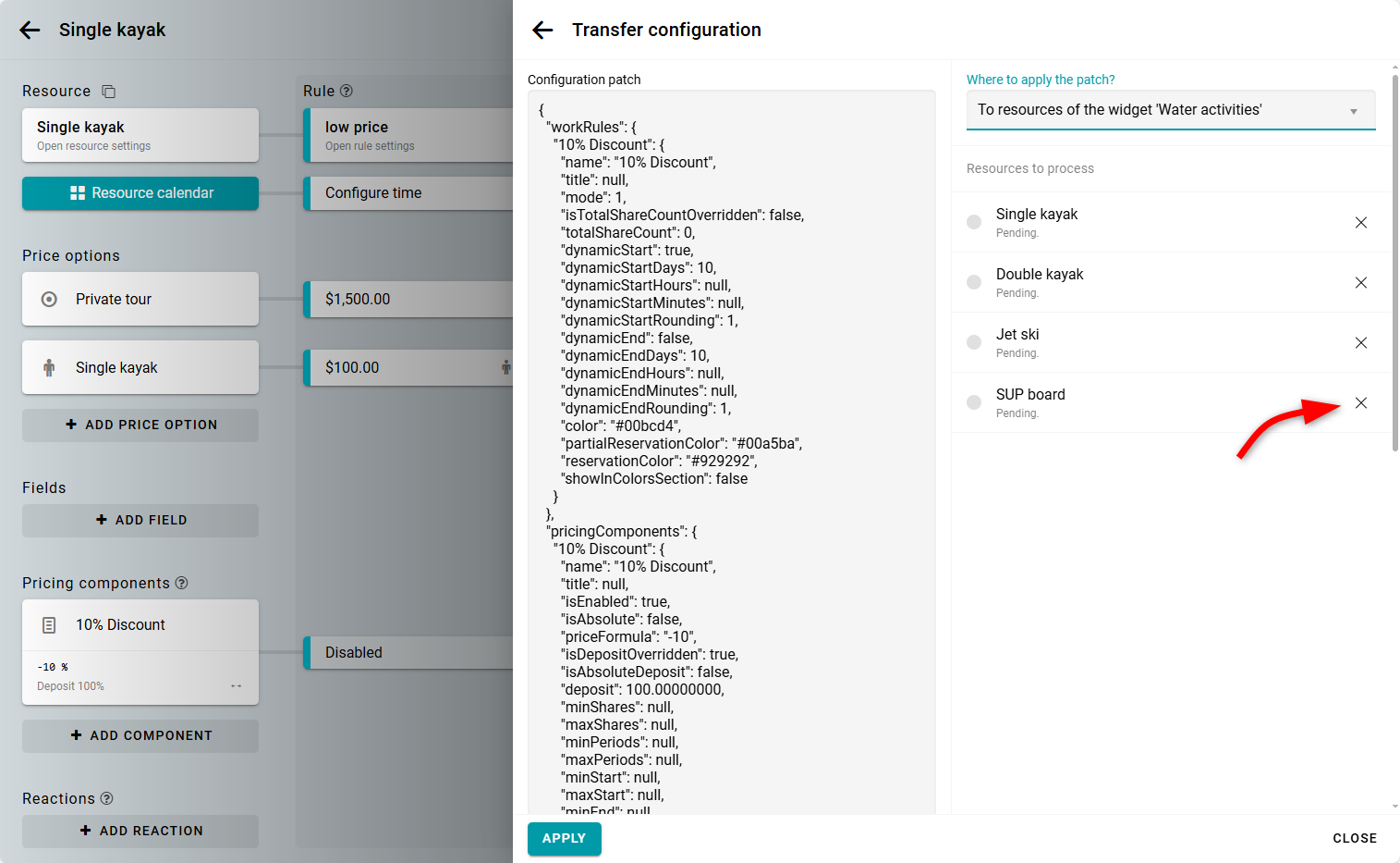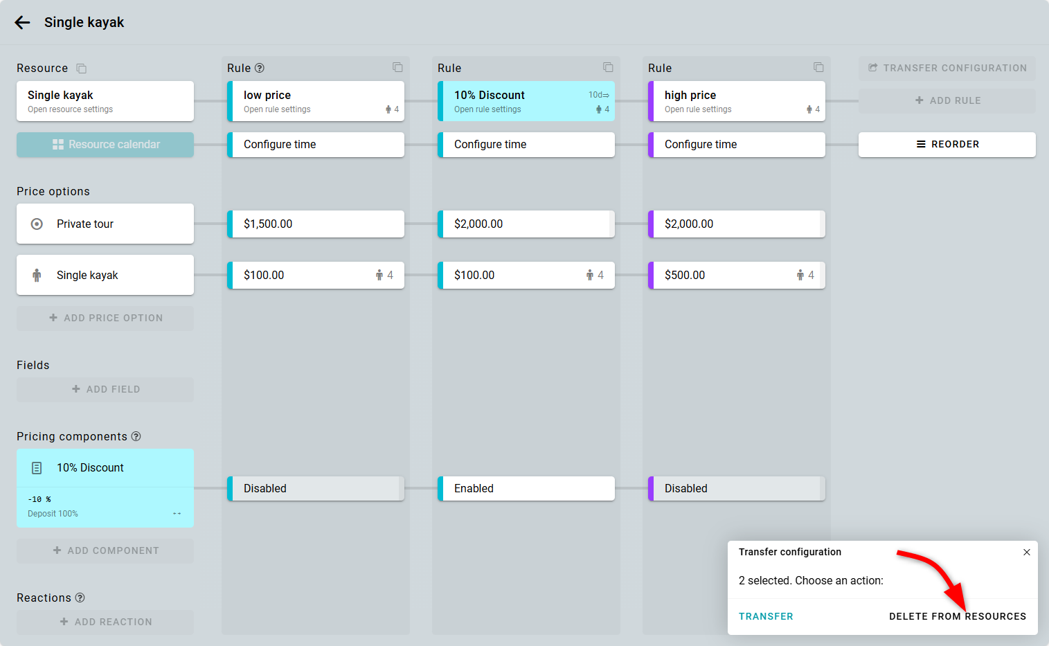 Puedes eliminar cualquier elemento de configuración: reglas, tarifas, campos, ajustes de precio y reacciones. También puedes eliminar sobrescrituras de elementos en sus intersecciones con reglas. En este caso, los ajustes del elemento simplemente se restablecerán a sus valores predeterminados.