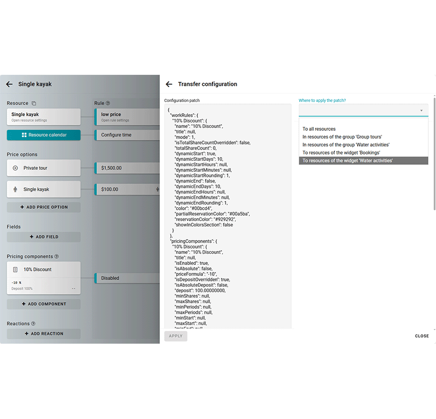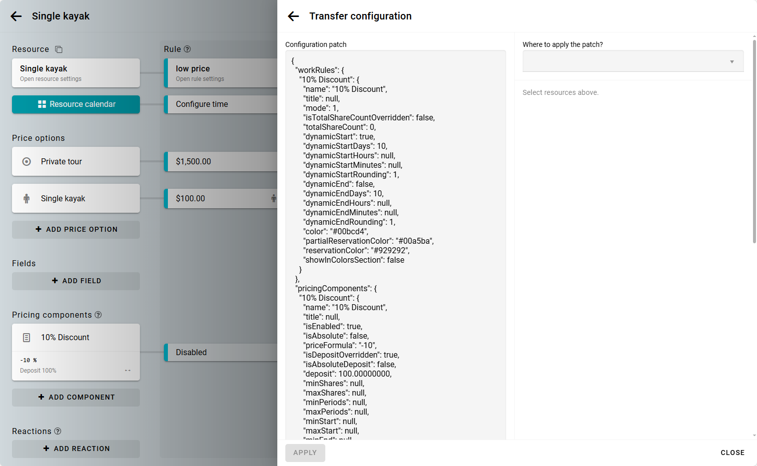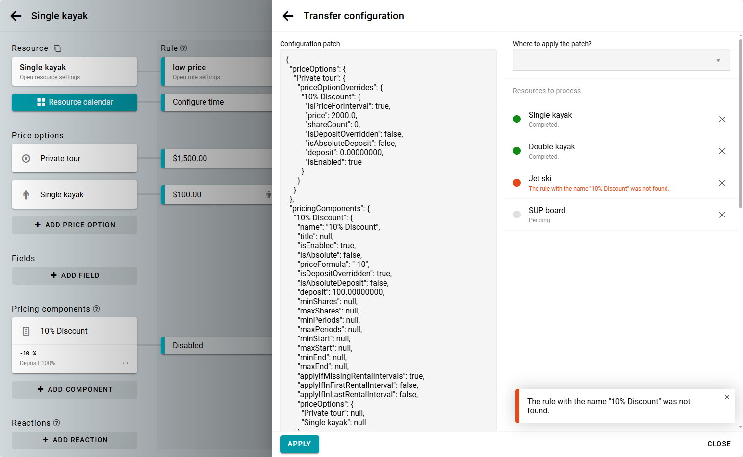 Puedes eliminar cualquier elemento de configuración: reglas, tarifas, campos, ajustes de precio y reacciones. También puedes eliminar sobrescrituras de elementos en sus intersecciones con reglas. En este caso, los ajustes del elemento simplemente se restablecerán a sus valores predeterminados.