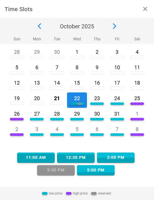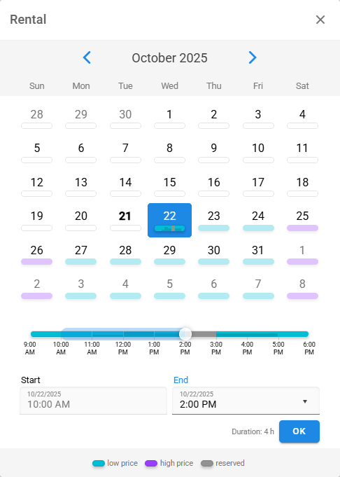 Alquiler se refiere a un período en el calendario que se divide en varios pasos, marcados por puntos a lo largo de la línea de tiempo. El cliente selecciona el punto de inicio y de fin por separado. Puedes configurar cualquier calendario con cualquier conjunto de pasos usando las reglas en la configuración del recurso.