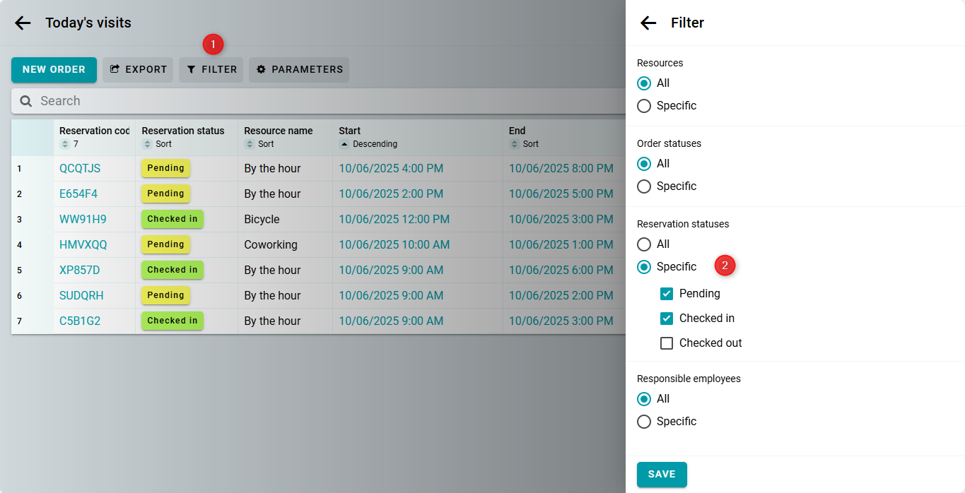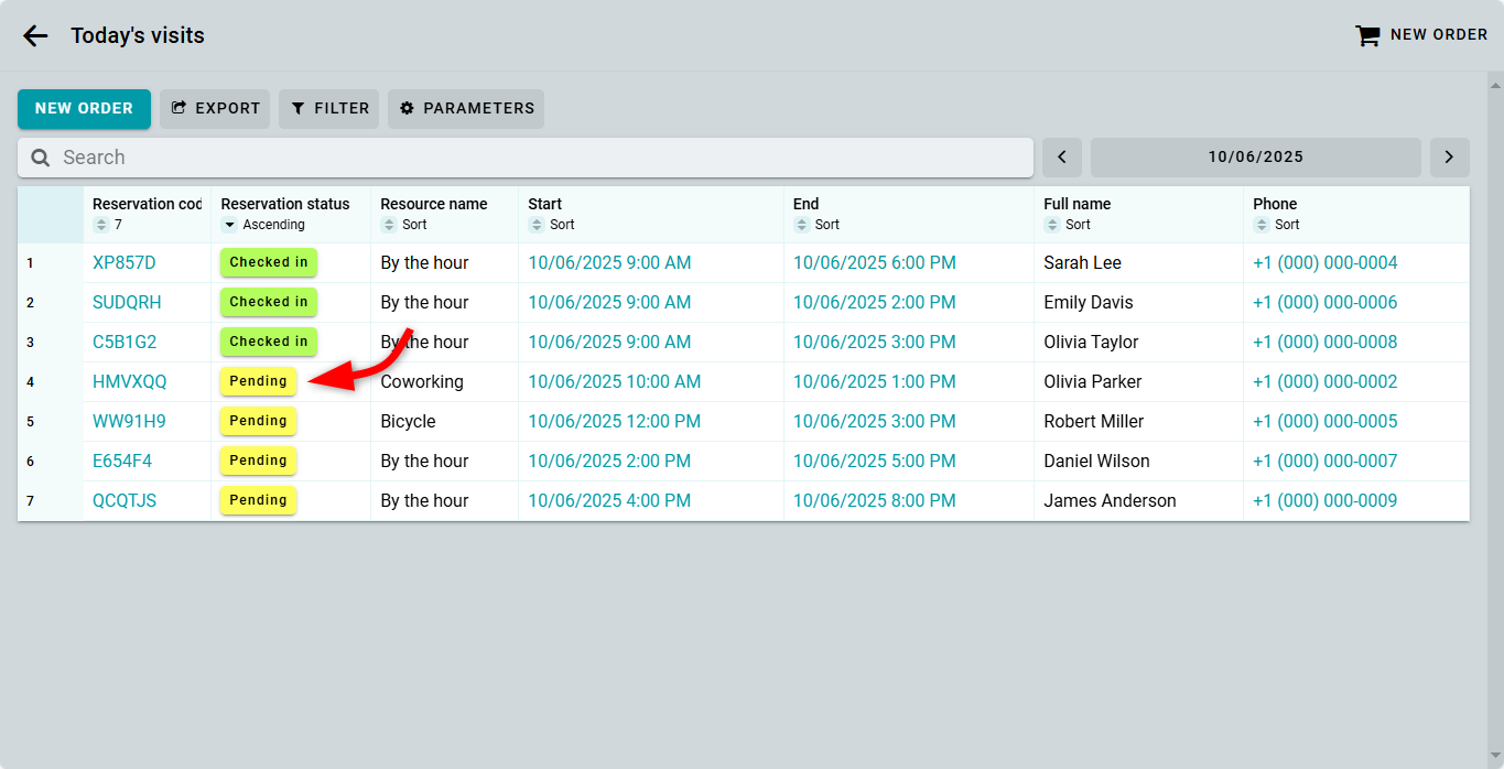 Haz clic en el botón de estado de reserva para registrar la llegada y salida del cliente. El estado cambiará de "Pendiente" a "Entrada" en el primer clic, y a "Salida" en el segundo clic. Una vez que pongas el estado en "Salida", la fila desaparecerá automáticamente por el filtro.