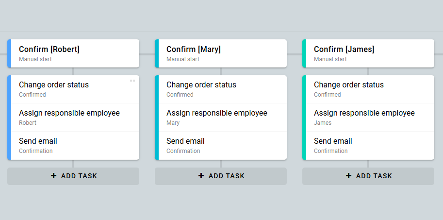 Para esto, crea una automatización diferente para cada empleado. Agrega la acción Asignar empleado responsable a las tareas de estas automatizaciones.