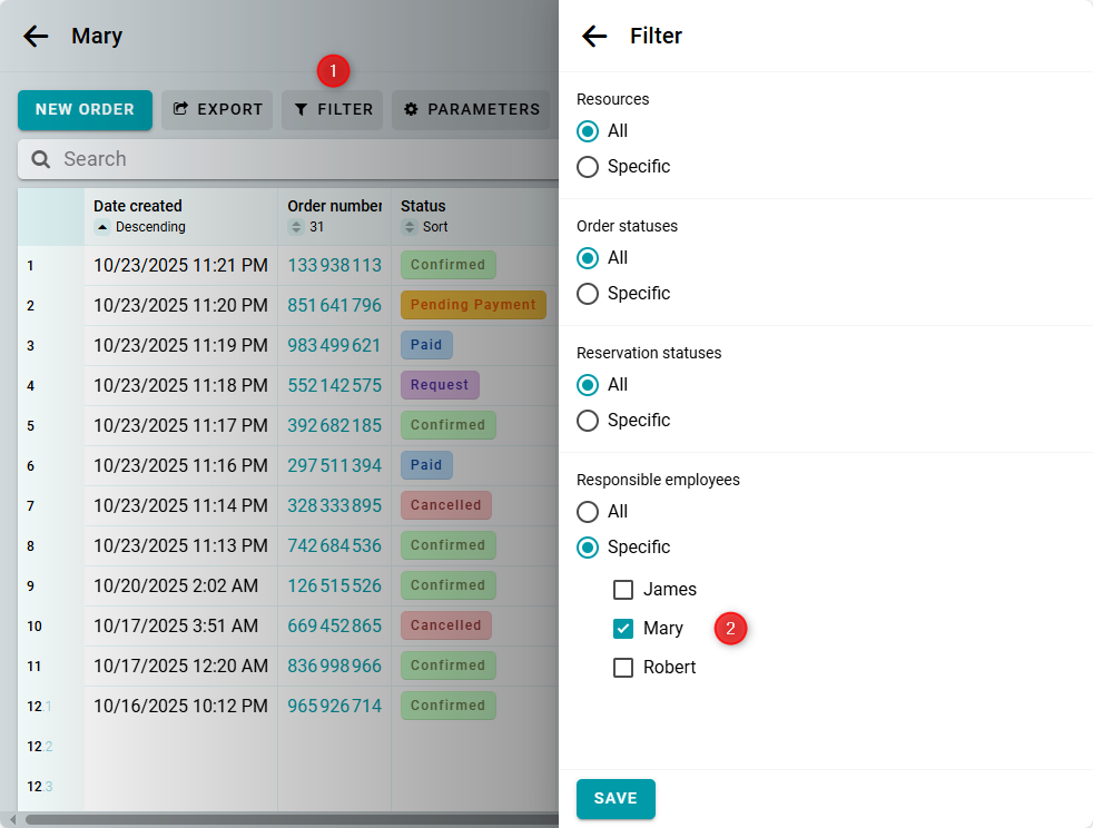 Después, crea una tabla. En la configuración de la tabla, filtra los pedidos por nombre de empleado. Así verás todos los pedidos asignados a un empleado específico.