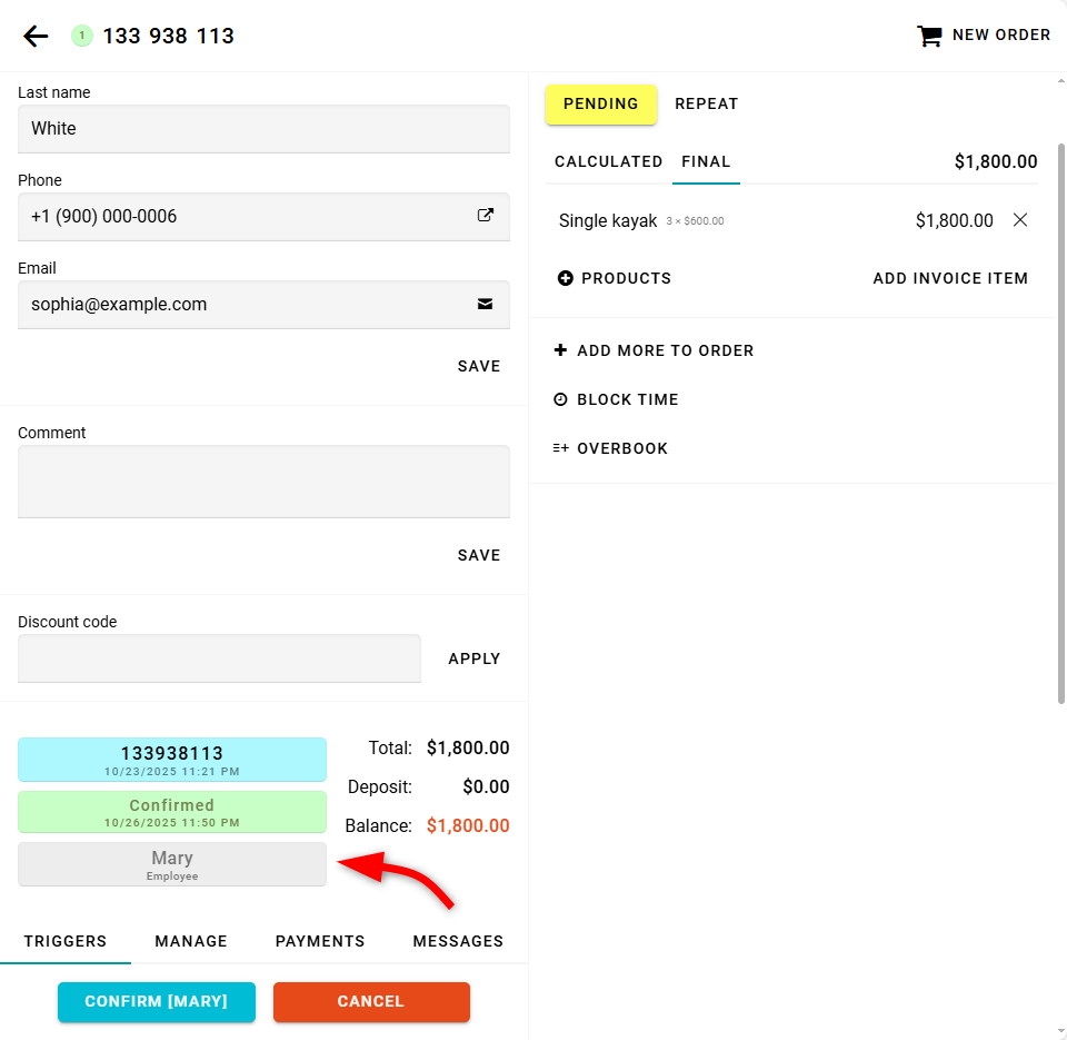 También verás el nombre del empleado responsable en el carrito del pedido.